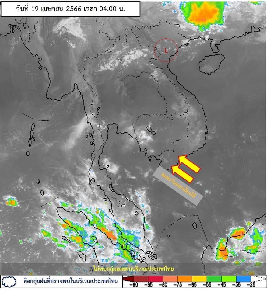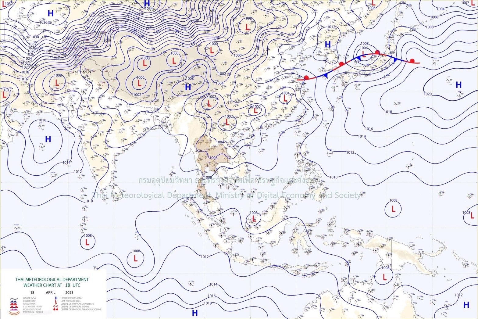 ลักษณะอากาศทั่วไป พยากรณ์อากาศ 24 ชั่วโมงข้างหน้า ประเทศไทยมีอากาศร้อนโดยทั่วไปกับมีฟ้าหลัวในตอนกลางวัน และมีอากาศร้อนจัดบางพื้นที่ ทั้งนี้เนื่องจากความกดอากาศต่ำเนื่องจากความร้อนปกคลุมประเทศไทยตอนบน ในขณะที่ลมใต้พัดปกคลุมภาคตะวันออกเฉียงเหนือตอนล่าง ภาคกลางตอนล่าง และภาคตะวันออก ลักษณะเช่นนี้ทำให้ประเทศไทยตอนบน ยังคงมีฝนฟ้าคะนองเกิดขึ้นได้บางพื้นที่ ขอให้ประชาชนบริเวณประเทศไทยตอนบน ดูแลรักษาสุขภาพเนื่องจากสภาพอากาศที่ร้อนถึงร้อนจัด รวมถึงระวังอันตรายจากฝนฟ้าคะนองและลมกระโชกแรงที่อาจจะเกิดขึ้น