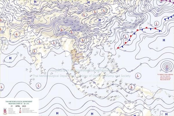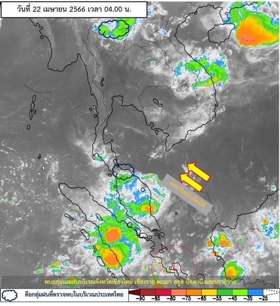 อนึ่ง ในช่วงวันที่ 23-26 เมษายน 2566 บริเวณความกดอากาศสูงหรือมวลอากาศเย็นกำลังปานกลางจากประเทศจีน จะแผ่ลงมาปกคลุมภาคตะวันออกเฉียงเหนือ และทะเลจีนใต้ ในขณะที่บริเวณประเทศไทยตอนบนมีอากาศร้อนถึงร้อนจัด ประกอบกับมีลมตะวันตกเฉียงใต้ และลมตะวันออกเฉียงใต้พัดปกคลุม ลักษณะเช่นนี้ทำให้ประเทศไทยตอนบนมีพายุฤดูร้อนเกิดขึ้น โดยมีลักษณะของพายุฝนฟ้าคะนอง ลมกระโชกแรง และลูกเห็บตกบางแห่ง รวมถึงอาจมีฟ้าผ่าเกิดขึ้นได้บางพื้นที่ จะเริ่มมีผลกระทบในภาคตะวันออกเฉียงเหนือ และด้านตะวันออกของภาคตะวันออกก่อน ส่วนภาคอื่นๆ จะได้รับผลกระทบในระยะถัดไป