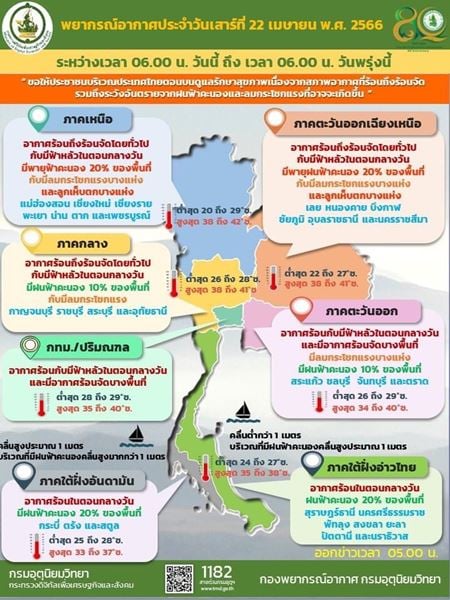 ลักษณะอากาศทั่วไป พยากรณ์อากาศ 24 ชั่วโมงข้างหน้า ประเทศไทยมีอากาศร้อนโดยทั่วไปกับมีฟ้าหลัวในตอนกลางวัน โดยมีอากาศร้อนจัดหลายพื้นที่ในบริเวณประเทศไทยตอนบน ทั้งนี้เนื่องจากความกดอากาศต่ำ เนื่องจากความร้อนปกคลุมประเทศไทยตอนบน ในขณะที่ลมฝ่ายตะวันตกและลมใต้พัดปกคลุมประเทศไทยตอนบน ลักษณะเช่นนี้ทำให้บริเวณดังกล่าว มีฝนฟ้าคะนองกับลมกระโชกแรงเกิดขึ้นได้บางพื้นที่ โดยภาคเหนือและภาคตะวันออกเฉียงเหนือ มีลูกเห็บตกบางแห่ง ขอให้ประชาชนบริเวณประเทศไทยตอนบนดูแลรักษาสุขภาพ เนื่องจากสภาพอากาศที่ร้อนถึงร้อนจัด รวมถึงระวังอันตรายจากฝนฟ้าคะนองและลมกระโชกแรงที่อาจจะเกิดขึ้น สำหรับลมตะวันตกเฉียงเหนือ และลมตะวันตกเฉียงใต้ พัดปกคลุมทะเลอันดามัน ภาคใต้ และอ่าวไทย ทำให้ภาคใต้มีฝนฟ้าคะนองเกิดขึ้นบางแห่ง ขอให้ประชาชนในบริเวณดังกล่าวระวังอันตรายจากฝนฟ้าคะนอง
