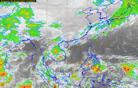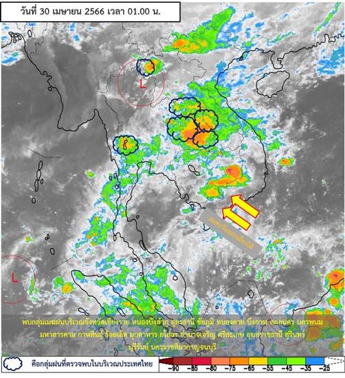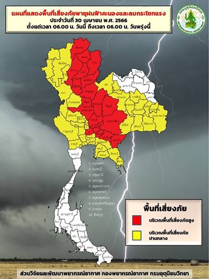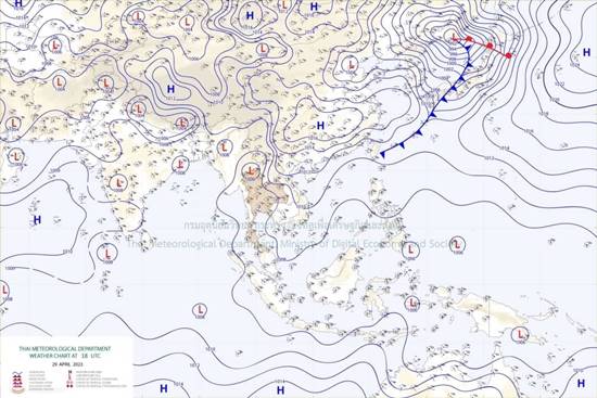 ลักษณะอากาศทั่วไป พยากรณ์อากาศ 24 ชั่วโมงข้างหน้า ประเทศไทยตอนบนมีพายุฤดูร้อนเกิดขึ้น โดยมีลักษณะของพายุฝนฟ้าคะนอง ลมกระโชกแรง และลูกเห็บตกบางแห่ง รวมถึงอาจมีฟ้าผ่าเกิดขึ้นได้บางพื้นที่ ขอให้ประชาชนในบริเวณดังกล่าวระวังอันตรายจากพายุฤดูร้อน โดยหลีกเลี่ยงการอยู่ในที่โล่งแจ้ง ใต้ต้นไม้ใหญ่ สิ่งปลูกสร้างและป้ายโฆษณาที่ไม่แข็งแรง ไม่ควรสวมใส่โลหะ และหลีกเลี่ยงการใช้โทรศัพท์มือถือขณะเกิดพายุฝนฟ้าคะนอง ส่วนเกษตรกรควรเตรียมการป้องกันและระวังความเสียหายที่จะเกิดต่อผลผลิตทางการเกษตรและอันตรายต่อสัตว์เลี้ยงไว้ด้วย ทั้งนี้เนื่องจากบริเวณความกดอากาศสูงหรือมวลอากาศเย็นกำลังปานกลางได้แผ่ปกคลุมประเทศไทยตอนบน และทะเลจีนใต้แล้ว ประกอบกับลมใต้และลมตะวันออกเฉียงใต้ที่พัดนำความชื้นจากอ่าวไทยและทะเลจีนใต้เข้ามาปกคลุมประเทศไทยตอนบนมีกำลังแรงขึ้น ในขณะที่ประเทศไทยตอนบนมีอากาศร้อน