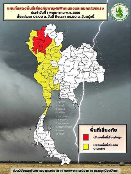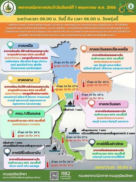 ลักษณะอากาศทั่วไป พยากรณ์อากาศ 24 ชั่วโมงข้างหน้า ประเทศไทยตอนบนมีพายุฤดูร้อนเกิดขึ้น โดยมีลักษณะของพายุฝนฟ้าคะนอง ลมกระโชกแรง และลูกเห็บตกบางแห่ง รวมถึงอาจมีฟ้าผ่าเกิดขึ้นได้บางพื้นที่ ขอให้ประชาชนในบริเวณดังกล่าวระวังอันตรายจากพายุฤดูร้อน โดยหลีกเลี่ยงการอยู่ในที่โล่งแจ้ง ใต้ต้นไม้ใหญ่ สิ่งปลูกสร้างและป้ายโฆษณาที่ไม่แข็งแรง ไม่ควรสวมใส่โลหะ และหลีกเลี่ยงการใช้โทรศัพท์มือถือขณะเกิดพายุฝนฟ้าคะนอง ส่วนเกษตรกรควรเตรียมการป้องกันและระวังความเสียหายที่จะเกิดต่อผลผลิตทางการเกษตรและอันตรายต่อสัตว์เลี้ยงไว้ด้วย ทั้งนี้เนื่องจากบริเวณความกดอากาศสูงหรือมวลอากาศเย็นกำลังปานกลางได้แผ่ปกคลุมประเทศไทยตอนบน และทะเลจีนใต้แล้ว ประกอบกับลมตะวันออกเฉียงใต้ที่พัดนำความชื้นจากอ่าวไทยและทะเลจีนใต้เข้ามาปกคลุมประเทศไทยตอนบนมีกำลังแรงขึ้น ในขณะที่ประเทศไทยตอนบนมีอากาศร้อน