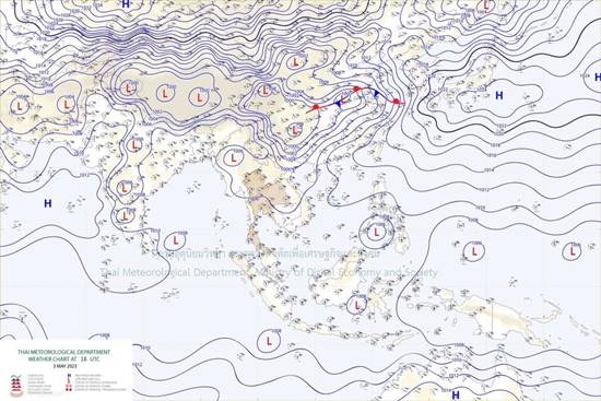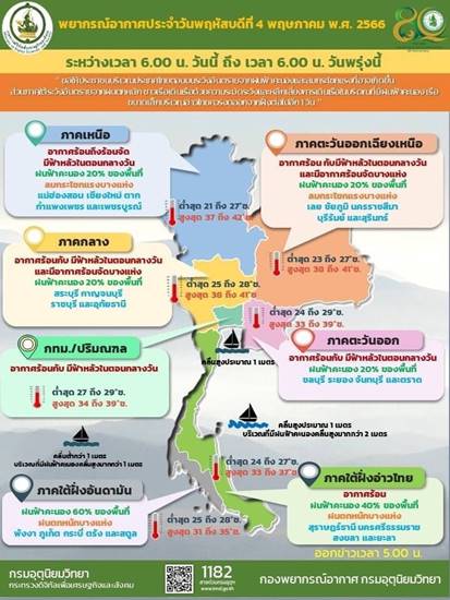 ลักษณะอากาศทั่วไป พยากรณ์อากาศ 24 ชั่วโมงข้างหน้า ความกดอากาศต่ำเนื่องจากความร้อนปกคลุมประเทศไทยตอนบน ทำให้บริเวณดังกล่าวมีอากาศร้อนโดยทั่วไป กับมีฟ้าหลัวในตอนกลางวัน โดยมีอากาศร้อนจัดบางพื้นที่ในภาคเหนือ ภาคตะวันออกเฉียงเหนือ และภาคกลาง ในขณะที่ลมใต้และลมตะวันตกเฉียงใต้พัดปกคลุมประเทศไทยตอนบน ทำให้บริเวณดังกล่าวยังคงมีฝนฟ้าคะนองและลมกระโชกแรงบางแห่งเกิดขึ้นได้ ขอให้ประชาชนในบริเวณประเทศไทยตอนบนระวังอันตรายจากฝนฟ้าคะนองและลมกระโชกแรงที่อาจจะเกิดขึ้นไว้ด้วย