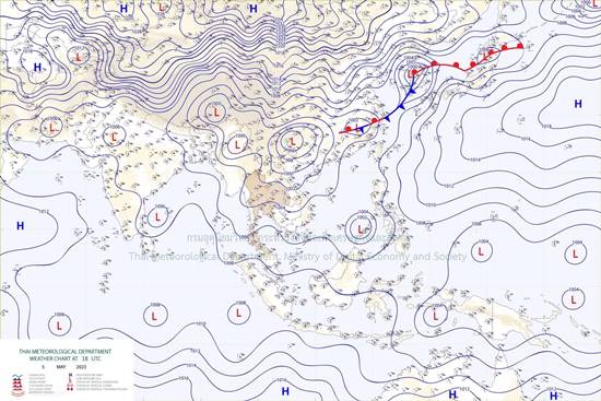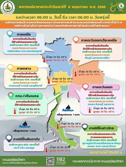 ลักษณะอากาศทั่วไป พยากรณ์อากาศ 24 ชั่วโมงข้างหน้า ความกดอากาศต่ำเนื่องจากความร้อนปกคลุมประเทศไทยตอนบน ทำให้มีอากาศร้อนถึงร้อนจัดกับมีฟ้าหลัวในตอนกลางวัน ในขณะที่ลมตะวันตกเฉียงใต้พัดปกคลุมบริเวณดังกล่าว ทำให้มีฝนน้อยแต่ยังคงมีฝนฟ้าคะนอง และลมกระโชกแรงบางแห่ง ขอให้ประชาชนในบริเวณประเทศไทยตอนบน ระวังอันตรายจากฝนฟ้าคะนองและลมกระโชกแรง ที่อาจจะเกิดขึ้นไว้ด้วย