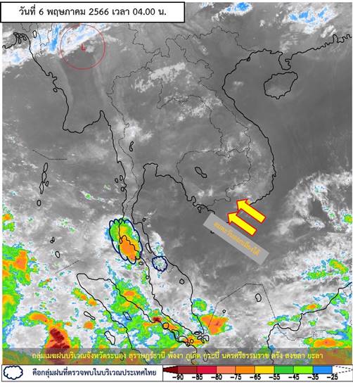 อนึ่ง ในช่วงวันที่ 8-10 พฤษภาคม 2566 บริเวณความกดอากาศสูง หรือมวลอากาศเย็นกำลังปานกลางจากประเทศจีน จะแผ่ลงมาปกคลุมประเทศไทยตอนบน และทะเลจีนใต้ ส่งผลให้ลมตะวันออกและลมตะวันออกเฉียงใต้ พัดนำความชื้นจากอ่าวไทยและทะเลจีนใต้ เข้ามาปกคลุมประเทศไทยตอนบน ซึ่งมีอากาศร้อนถึงร้อนจัด ลักษณะเช่นนี้ทำให้ประเทศไทยตอนบน มีพายุฤดูร้อนเกิดขึ้น โดยมีลักษณะของพายุฝนฟ้าคะนองลมกระโชกแรงและลูกเห็บตกบางแห่ง รวมถึงอาจมีฟ้าผ่าเกิดขึ้นได้บางพื้นที่ โดยเริ่มมีผลกระทบในภาคตะวันออกเฉียงเหนือก่อน