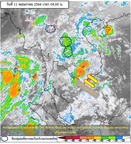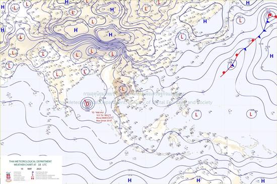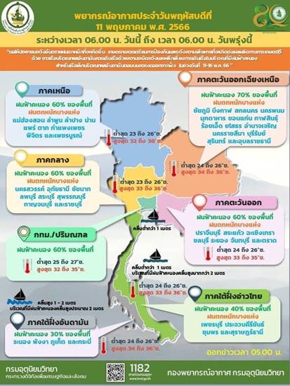 อนึ่ง พายุดีเปรสชั่นบริเวณอ่าวเบงกอลตอนล่าง มีแนวโน้มจะทวีกำลังแรงขึ้นเป็นพายุไซโคลนในระยะต่อไป คาดว่าจะเคลื่อนขึ้นฝั่งประเทศบังคลาเทศและเมียนมา ในช่วงวันที่ 14-15 พ.ค. 66 แต่ส่งผลให้ในช่วงวันที่ 11-14 พ.ค. 66 บริเวณประเทศไทยมีฝนตกต่อเนื่อง และมีฝนตกหนักบางแห่ง สำหรับคลื่นลมบริเวณทะเลอันดามันตอนบนคลื่นสูงประมาณ 2 เมตร บริเวณที่มีฝนฟ้าคะนองคลื่นสูงมากกว่า 3 เมตร ชาวเรือบริเวณทะเลอันดามันควรเดินเรือด้วยความระมัดระวัง และหลีกเลี่ยงการเดินเรือในบริเวณที่มีฝนฟ้าคะนอง สำหรับเรือเล็กบริเวณทะเลอันดามันตอนบน ควรงดออกจากฝั่ง ในช่วงวันที่ 11-16 พ.ค. 66