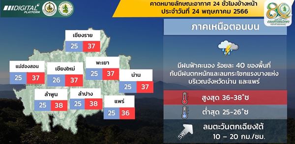 บริเวณจังหวัดเชียงราย พะเยา น่าน แพร่ อุตรดิตถ์ พิจิตร พิษณุโลก และเพชรบูรณ์ โดยมีอากาศร้อนในตอนกลางวัน อุณหภูมิต่ำสุด 23-27 องศาเซลเซียส อุณหภูมิสูงสุด 36-39 องศาเซลเซียส ลมตะวันตกเฉียงใต้ ความเร็ว 10-20 กม./ชม.
