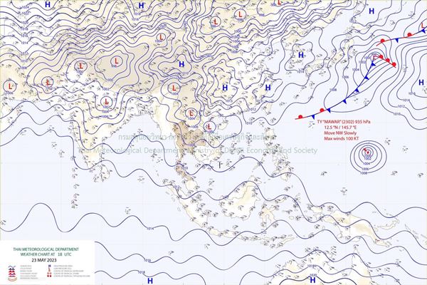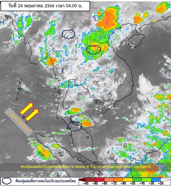 พยากรณ์อากาศ 24 ชั่วโมงข้างหน้า มรสุมตะวันตกเฉียงใต้พัดปกคลุมทะเลอันดามัน ประเทศไทย และอ่าวไทย ประกอบกับมีหย่อมความกดอากาศต่ำปกคลุมบริเวณประเทศเวียดนามตอนบนและอ่าวตังเกี๋ย ลักษณะเช่นนี้ทำให้ประเทศไทยมีฝนฟ้าคะนอง กับมีลมกระโชกแรงเกิดขึ้นได้บางพื้นที่ โดยมีฝนตกหนักบางแห่งในภาคเหนือ ภาคตะวันออกเฉียงเหนือ และภาคตะวันออก แต่ยังคงมีอากาศร้อนในตอนกลางวัน ขอให้ประชาชนระวังอันตรายจากฝนฟ้าคะนองและลมกระโชกแรง รวมทั้งดูแลรักษาสุขภาพเนื่องจากสภาพอากาศที่เปลี่ยนแปลง
