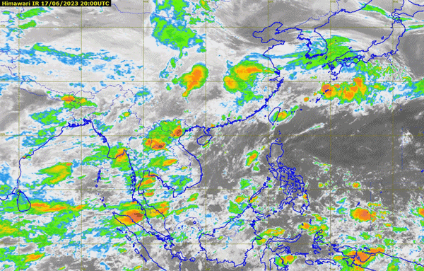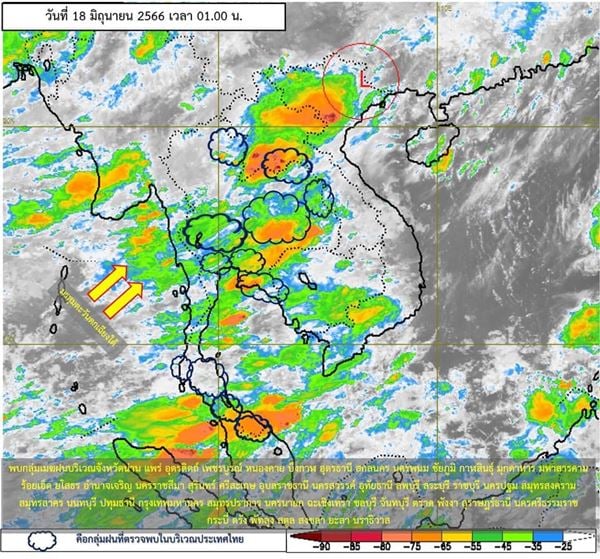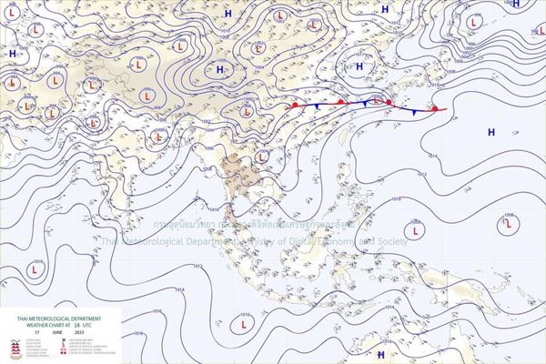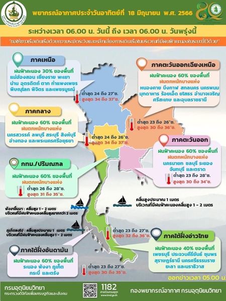 ลักษณะอากาศทั่วไป พยากรณ์อากาศ 24 ชั่วโมงข้างหน้า มรสุมตะวันตกเฉียงใต้กำลังปานกลางพัดปกคลุมทะเลอันดามัน ประเทศไทย และอ่าวไทย ประกอบกับมีหย่อมความกดอากาศต่ำปกคลุมบริเวณประเทศเวียดนามตอนบน ลักษณะเช่นนี้ทำให้ประเทศไทยยังคงมีฝนฟ้าคะนองเกิดขึ้นได้ ส่วนมากบริเวณด้านรับมรสุม และมีฝนตกหนักบางแห่งในภาคตะวันออกเฉียงเหนือ ภาคกลาง และภาคตะวันออก