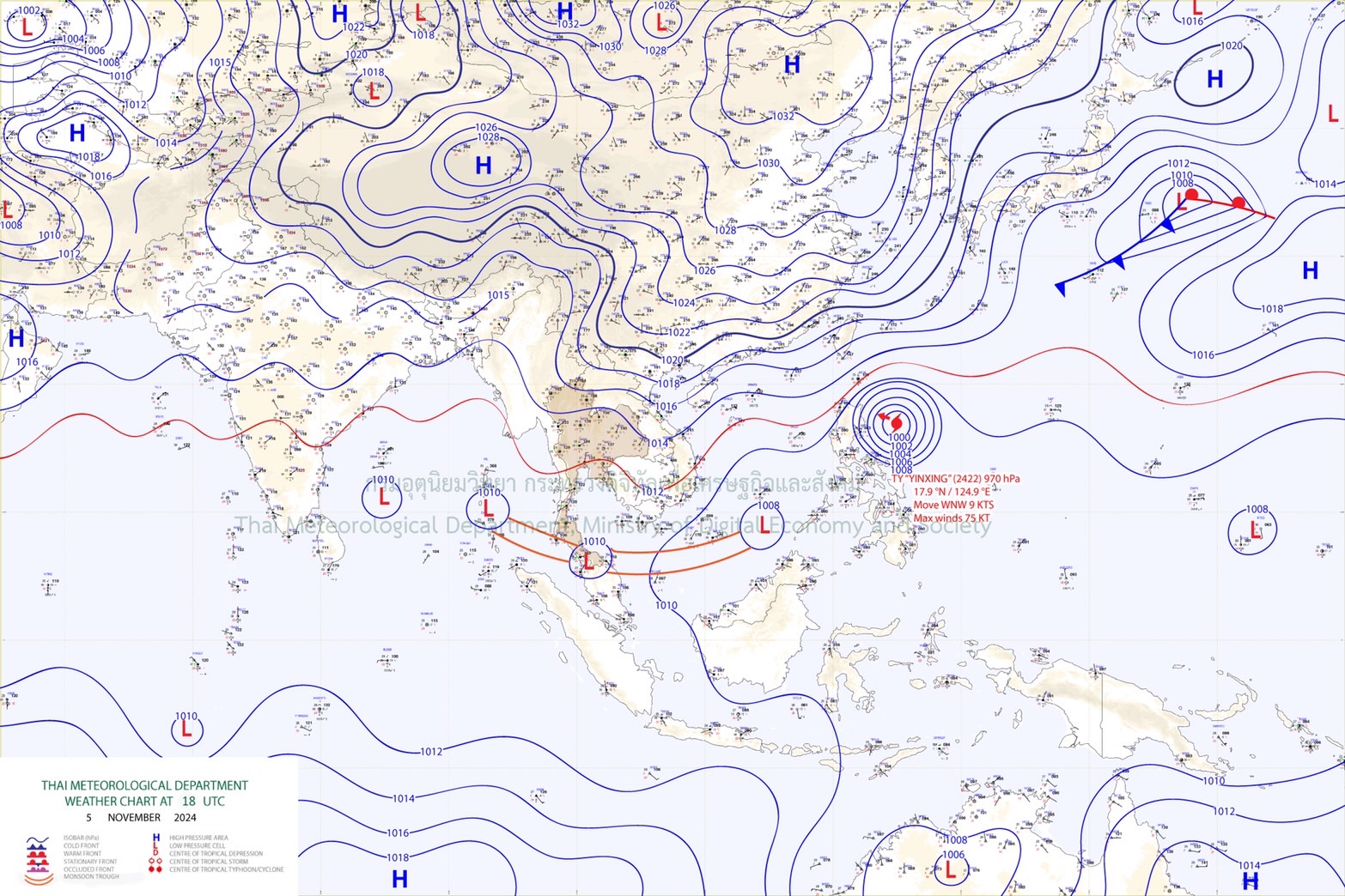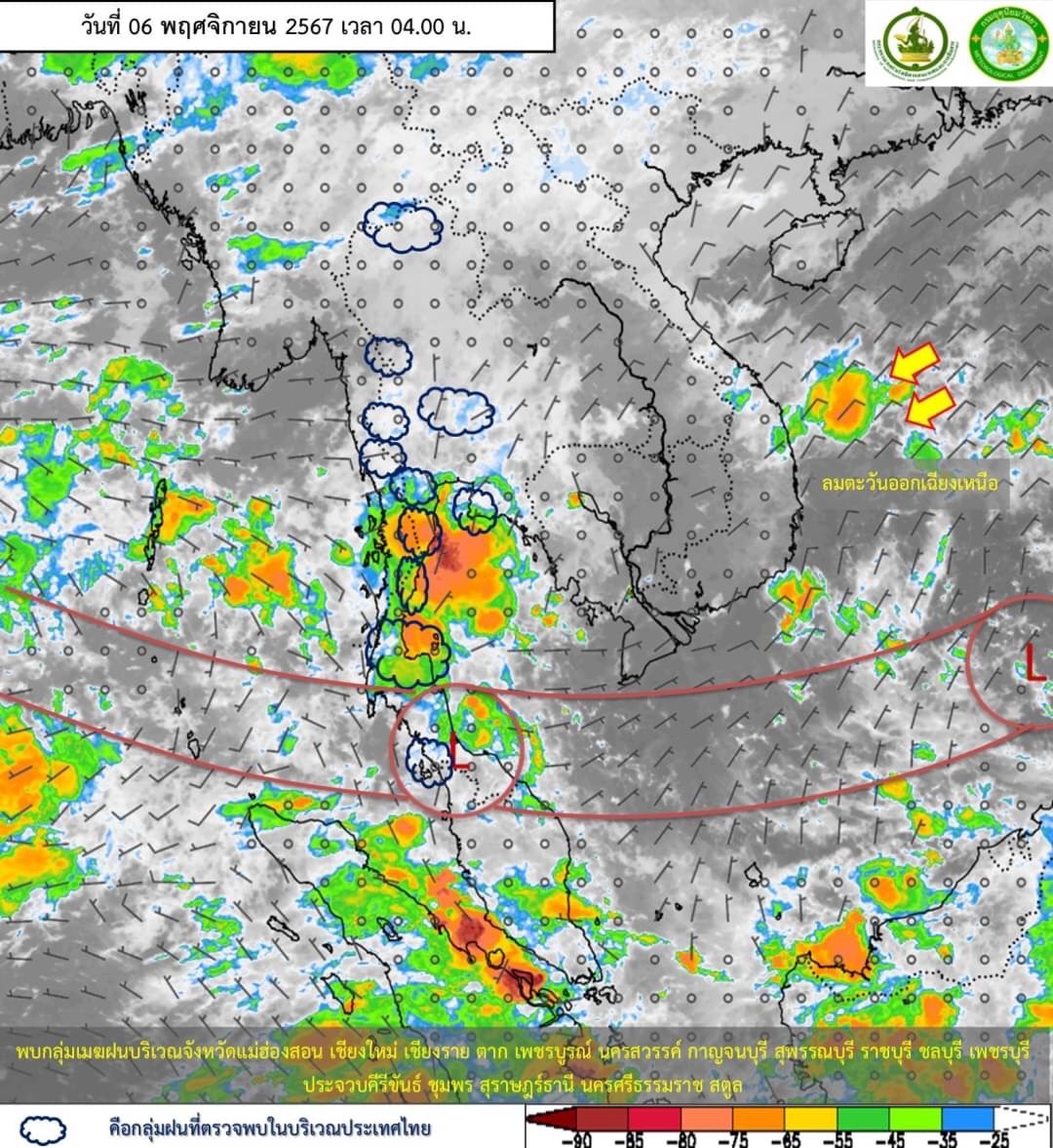 ลักษณะอากาศทั่วไป พยากรณ์อากาศ 24 ชั่วโมงข้างหน้า ร่องมรสุมพาดผ่านภาคใต้ตอนล่าง ในขณะที่มีมรสุมตะวันออกเฉียงเหนือกำลังปานกลางพัดปกคลุมอ่าวไทยและภาคใต้ ทำให้ภาคใต้มีฝนตกหนักถึงหนักมากบางแห่ง ขอให้ประชาชนในบริเวณดังกล่าวระวังอันตรายจากฝนตกหนักถึงหนักมากและฝนที่ตกสะสม ซึ่งอาจทำให้เกิดน้ำท่วมฉับพลันและน้ำป่าไหลหลาก โดยเฉพาะพื้นที่ลาดเชิงเขาใกล้ทางน้ำไหลผ่านและพื้นที่ลุ่มไว้ด้วย ส่วนคลื่นลมบริเวณอ่าวไทยและทะเลอันดามัน มีกำลังปานกลาง โดยอ่าวไทยมีคลื่นสูง 1–2 เมตร ทะเลอันดามันมีคลื่นสูงประมาณ 1 เมตร บริเวณที่มีฝนฟ้าคะนองคลื่นสูงมากกว่า 2 เมตร ขอให้ชาวเรือในบริเวณดังกล่าวเดินเรือด้วยความระมัดระวัง และหลีกเลี่ยงการเดินเรือในบริเวณที่มีฝนฟ้าคะนองไว้ด้วย