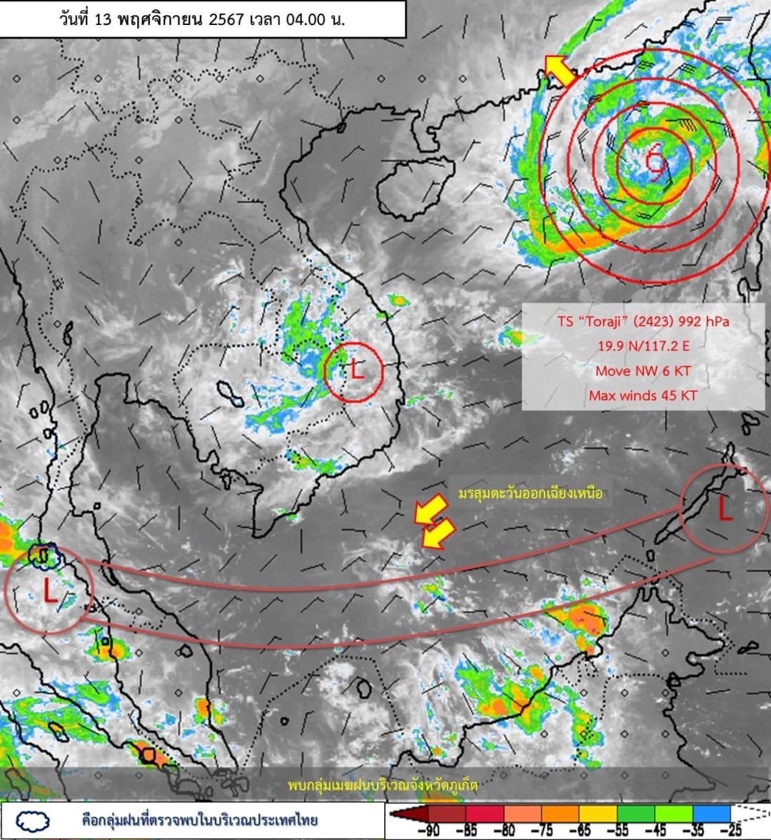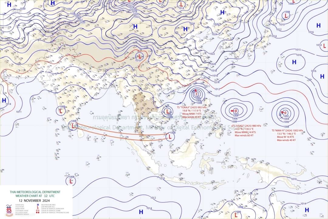 อนึ่ง พายุโซนร้อน “โทราจี” บริเวณทะเลจีนใต้ตอนบน คาดว่าจะเคลื่อนเข้าใกล้เกาะไหหลำ ประเทศจีน ในช่วงวันที่ 14-15 พ.ย. 2567 และจะอ่อนกำลังลงเป็นพายุดีเปรสชัน และหย่อมความกดอากาศต่ำกำลังแรงตามลำดับ โดยพายุนี้ไม่มีผลต่อลักษณะอากาศของประเทศไทยโดยตรง ขอให้ผู้ที่จะเดินทางไปบริเวณดังกล่าวตรวจสอบสภาพอากาศก่อนออกเดินทาง
