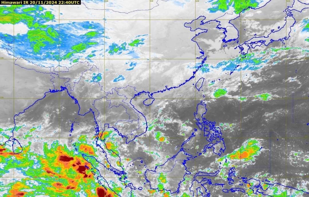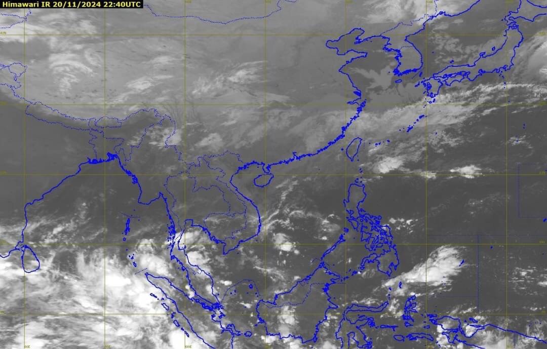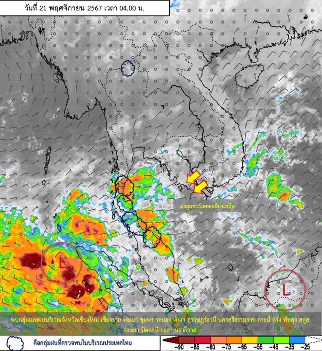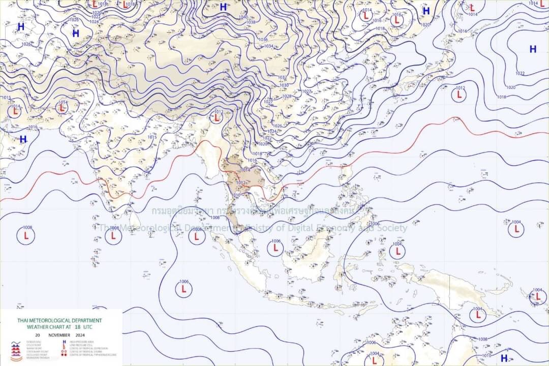 ลักษณะอากาศทั่วไป พยากรณ์อากาศ 24 ชั่วโมงข้างหน้า บริเวณความกดอากาศสูงหรือมวลอากาศเย็นกำลังปานกลางจากประเทศจีนปกคลุมประเทศไทยตอนบนและทะเลจีนใต้ ลักษณะเช่นนี้ทำให้บริเวณภาคเหนือและภาคตะวันออกเฉียงเหนือ มีอากาศเย็นในตอนเช้า กับมีลมแรง ในขณะที่มีลมตะวันออกพัดปกคลุมบริเวณภาคตะวันออกและภาคกลางตอนล่าง ทำให้บริเวณดังกล่าวมีฝนเล็กน้อยบางแห่ง ขอให้ประชาชนบริเวณประเทศไทยตอนบนดูแลรักษาสุขภาพเนื่องจากสภาวะอากาศที่เปลี่ยนแปลงไว้ด้วย