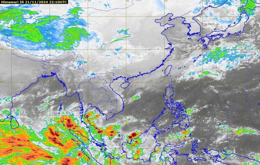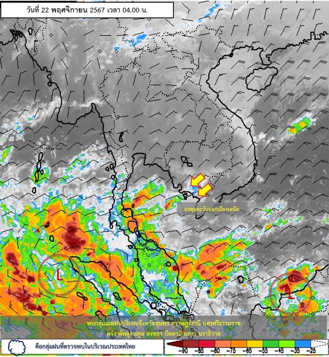 สำหรับมรสุมตะวันออกเฉียงเหนือที่พัดปกคลุมอ่าวไทย และภาคใต้มีกำลังปานกลาง ทำให้ภาคใต้มีฝนตกหนักถึงหนักมากบางแห่ง ขอให้ประชาชนในบริเวณดังกล่าวระวังอันตรายจากฝนตกหนักถึงหนักมากและฝนที่ตกสะสม ซึ่งอาจทำให้เกิดน้ำท่วมฉับพลันและน้ำป่าไหลหลาก โดยเฉพาะพื้นที่ลาดเชิงเขาใกล้ทางน้ำไหลผ่านและพื้นที่ลุ่ม ส่วนคลื่นลมบริเวณอ่าวไทยตอนล่างสูงประมาณ 2 เมตร อ่าวไทยตอนบนมีคลื่นสูง 1–2 เมตร และทะเลอันดามันมีคลื่นสูงประมาณ 1 เมตร ห่างฝั่งคลื่นสูง 1–2 เมตร บริเวณที่มีฝนฟ้าคะนองคลื่นสูงมากกว่า 2 เมตร ขอให้ชาวเรือเดินเรือด้วยความระมัดระวังและหลีกเลี่ยงการเดินเรือในบริเวณที่มีฝนฟ้าคะนองไว้ด้วย