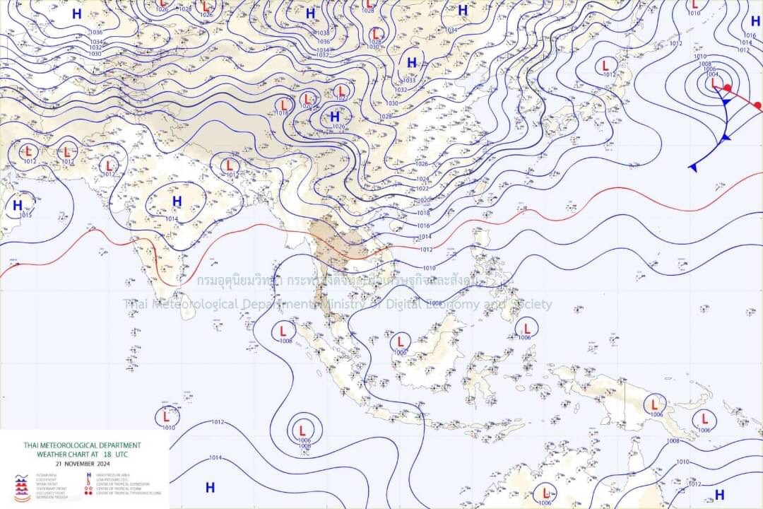 ลักษณะอากาศทั่วไป พยากรณ์อากาศ 24 ชั่วโมงข้างหน้า บริเวณความกดอากาศสูงหรือมวลอากาศเย็นกำลังปานกลางจากประเทศจีนปกคลุมประเทศไทยตอนบนและทะเลจีนใต้ ลักษณะเช่นนี้ทำให้บริเวณภาคเหนือและภาคตะวันออกเฉียงเหนือ มีอากาศเย็นในตอนเช้า ในขณะที่มีลมตะวันออกพัดปกคลุมบริเวณภาคตะวันออกและภาคกลางตอนล่าง ทำให้บริเวณดังกล่าวมีฝนเล็กน้อยบางแห่ง ขอให้ประชาชนบริเวณประเทศไทยตอนบนดูแลรักษาสุขภาพเนื่องจากสภาวะอากาศที่เปลี่ยนแปลงไว้ด้วย