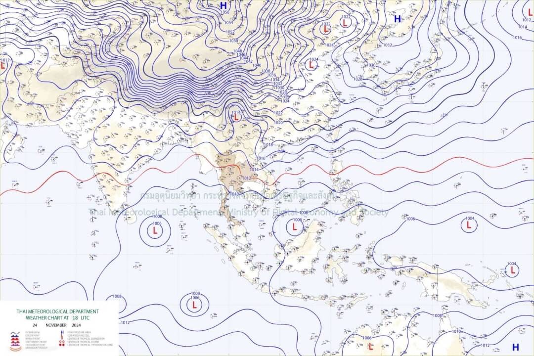 ลักษณะอากาศทั่วไป พยากรณ์อากาศ 24 ชั่วโมงข้างหน้า บริเวณความกดอากาศสูงหรือมวลอากาศเย็นกำลังปานกลางที่ปกคลุมประเทศไทยตอนบนและทะเลจีนใต้มีกำลังอ่อนลง ลักษณะเช่นนี้ทำให้ประเทศไทยตอนบนมีอุณหภูมิสูงขึ้นกับมีหมอกบางในตอนเช้า แต่ยังคงทำให้ภาคเหนือและภาคตะวันออกเฉียงเหนือมีอากาศเย็นในตอนเช้า ขอให้ประชาชนบริเวณประเทศไทยตอนบนดูแลรักษาสุขภาพเนื่องจากสภาวะอากาศที่เปลี่ยนแปลงและระมัดระวังการสัญจรผ่านบริเวณที่มีหมอกไว้ด้วย