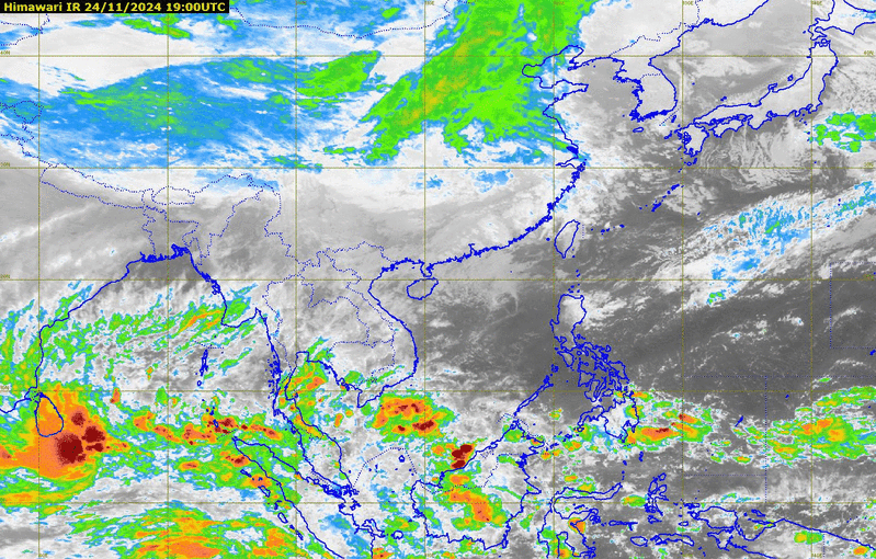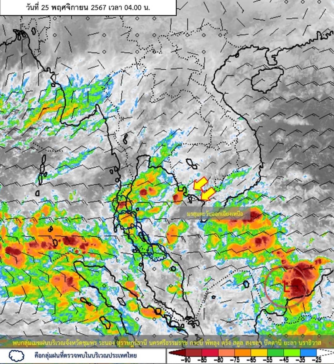 ภาคใต้(ฝั่งตะวันออก) มีฝนฟ้าคะนอง ร้อยละ 70 ของพื้นที่ และมีฝนตกหนักถึงหนักมากบางแห่งบริเวณจังหวัดชุมพร สุราษฎร์ธานี นครศรีธรรมราช พัทลุง สงขลา ปัตตานี ยะลา และนราธิวาสอุณหภูมิต่ำสุด 23-25 องศาเซลเซียส