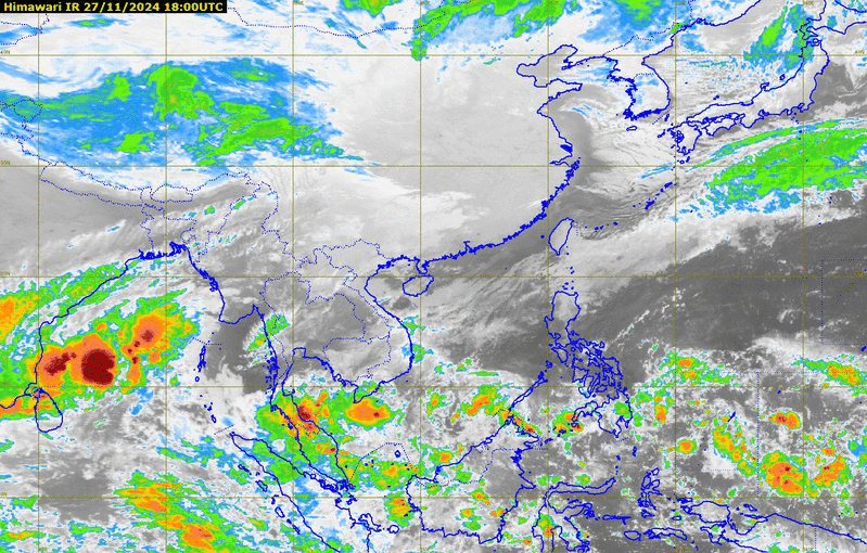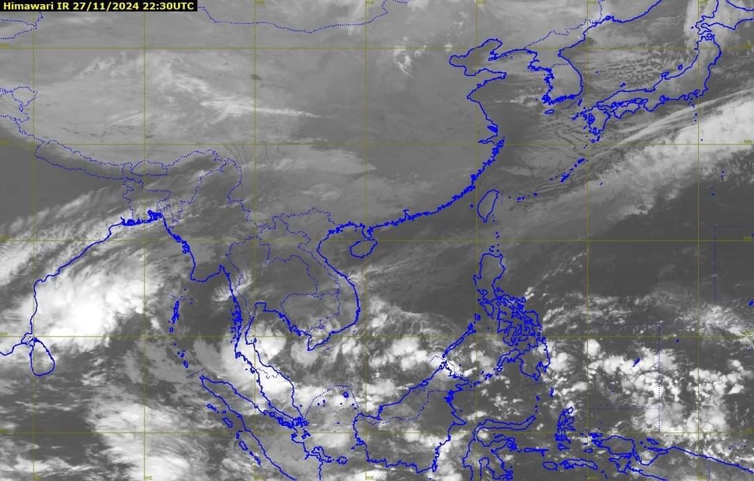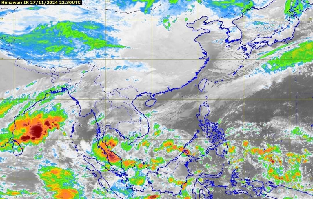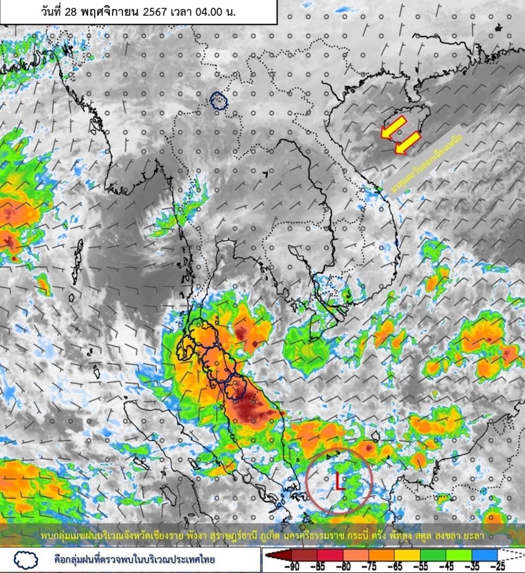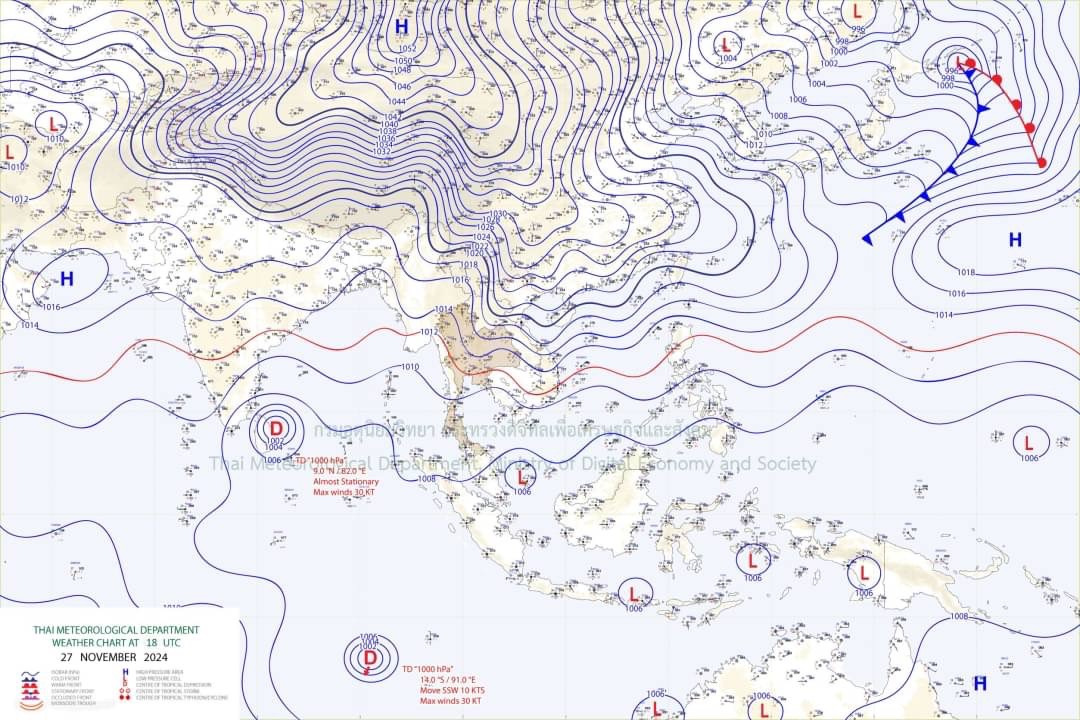 สำหรับมรสุมตะวันออกเฉียงเหนือที่พัดปกคลุมอ่าวไทยและภาคใต้มีกำลังค่อนข้างแรง ในขณะที่มีหย่อมความกดอากาศต่ำปกคลุมบริเวณชายฝั่งตะวันออกของประเทศมาเลเซีย โดยมีแนวโน้มเคลื่อนผ่านประเทศมาเลเซียลงสู่ทะเลอันดามันตอนล่าง ทำให้ภาคใต้ตอนล่างมีฝนตกหนักถึงหนักมากหลายพื้นที่ ขอให้ประชาชนบริเวณภาคใต้ตอนล่างระวังอันตรายจากฝนตกหนักถึงหนักมากและฝนที่ตกสะสม ซึ่งทำให้เกิดน้ำท่วมฉับพลันและน้ำป่าไหลหลาก โดยเฉพาะพื้นที่ลาดเชิงเขาใกล้ทางน้ำไหลผ่านและพื้นที่ลุ่มไว้ด้วย สำหรับคลื่นลมบริเวณอ่าวไทยมีกำลังค่อนข้างแรง โดยอ่าวไทยตอนบนมีคลื่นสูงประมาณ 2 เมตร บริเวณที่มีฝนฟ้าคะนองคลื่นสูงมากกว่า 2 เมตร ส่วนอ่าวไทยตอนล่างมีคลื่นสูง 2–3 เมตร บริเวณที่มีฝนฟ้าคะนองคลื่นสูงมากกว่า 3 เมตร ขอให้ชาวเรือควรเดินเรือด้วยความระมัดระวังและหลีกเลี่ยงการเดินเรือในบริเวณที่มีฝนฟ้าคะนอง สำหรับเรือเล็กบริเวณอ่าวไทยตอนล่างควรงดออกจากฝั่งจนถึงวันที่ 30 พ.ย. 67 และขอให้ประชาชนบริเวณภาคใต้ตอนล่างระวังอันตรายจากคลื่นซัดฝั่งไว้ด้วย