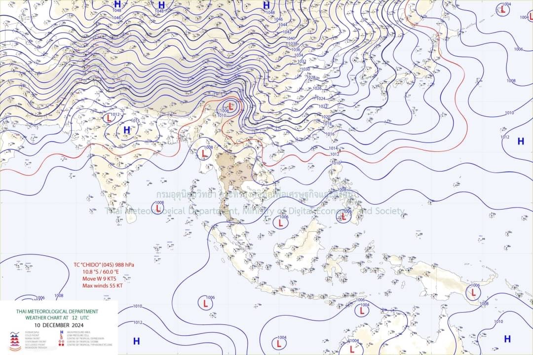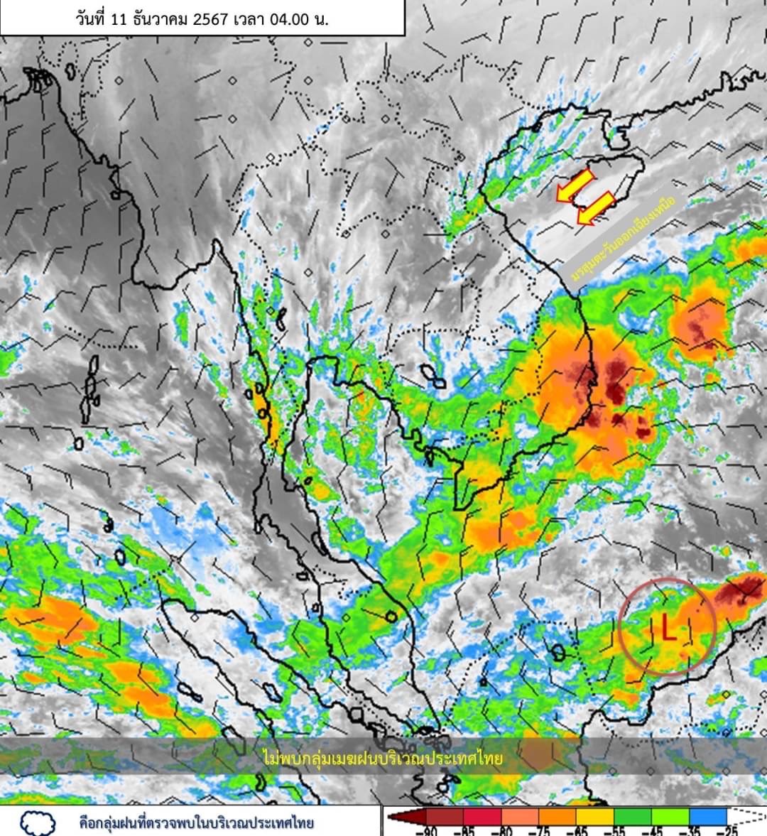 อนึ่ง ในช่วงวันที่ 12 – 16 ธ.ค. 67 บริเวณความกดอากาศสูงหรือมวลอากาศเย็นกำลังค่อนข้างแรงอีกระลอกหนึ่งจากประเทศจีนจะแผ่ลงมาปกคลุมประเทศไทยตอนบนและทะเลจีนใต้ ทำให้บริเวณดังกล่าวมีอุณหภูมิลดลงกับมีลมแรง ในขณะที่มรสุมตะวันออกเฉียงเหนือที่พัดปกคลุมอ่าวไทยและภาคใต้จะมีกำลังแรงขึ้น ประกอบกับจะมีหย่อมความกดอากาศต่ำเคลื่อนผ่านอ่าวไทยและภาคใต้ ในช่วงวันที่ 13 – 15 ธ.ค. 67 ทำให้ภาคใต้มีฝนเพิ่มขึ้นและมีฝนตกหนักถึงหนักมากบางแห่ง