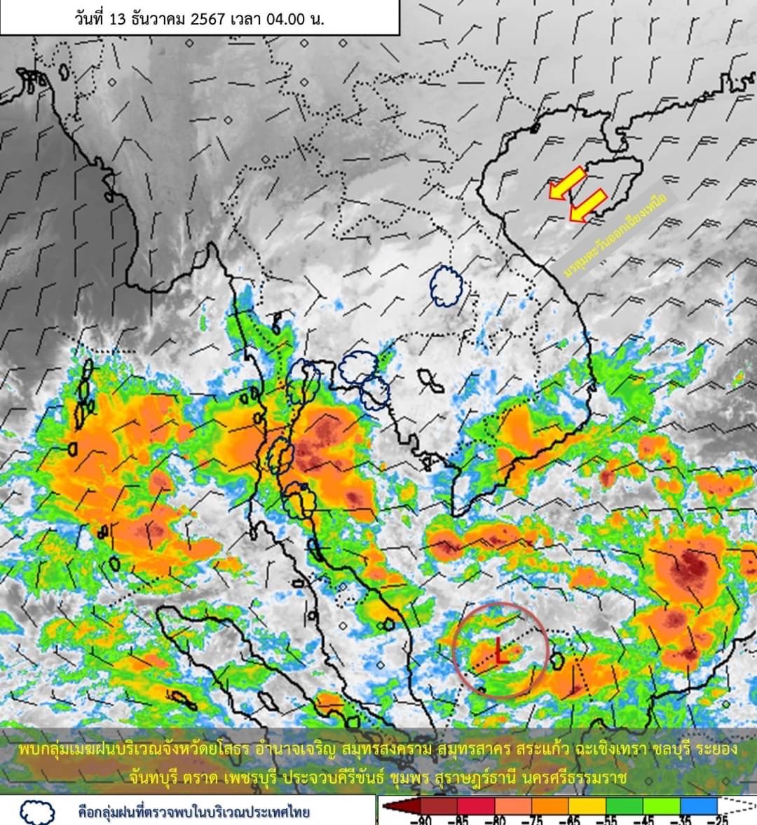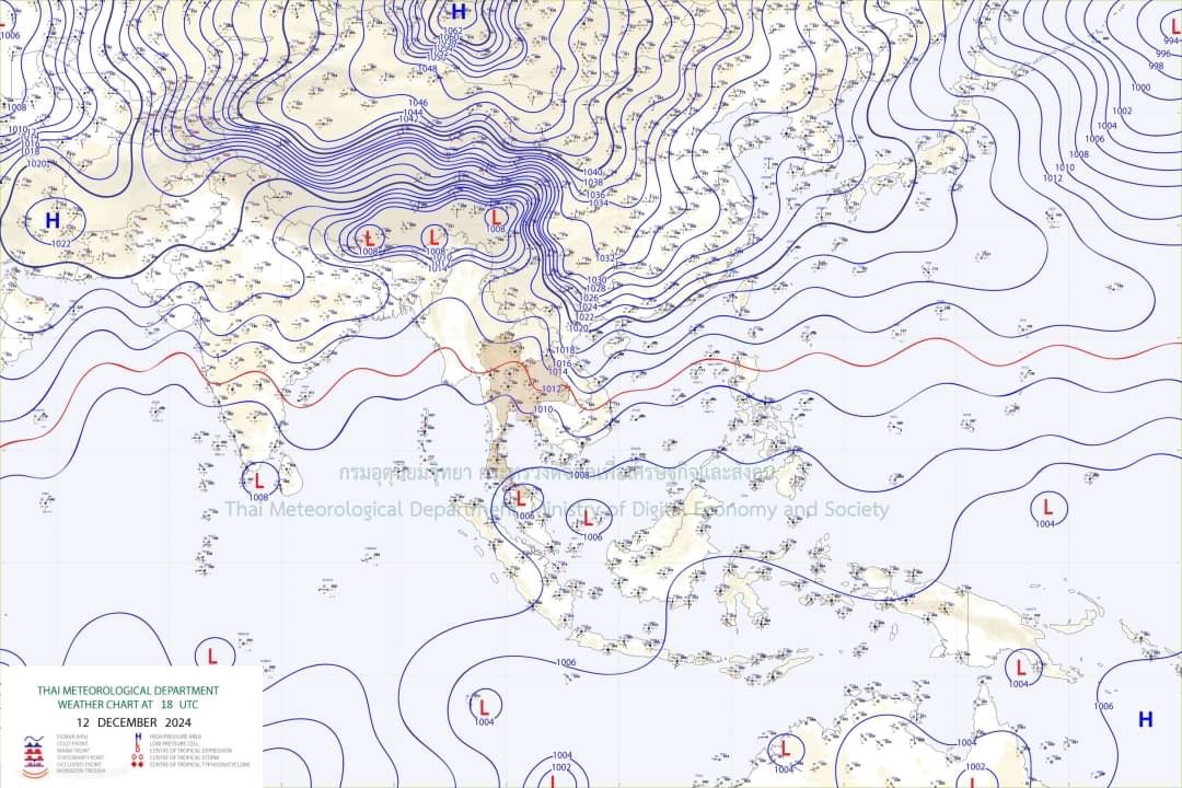 ลักษณะอากาศทั่วไป พยากรณ์อากาศ 24 ชั่วโมงข้างหน้า บริเวณความกดอากาศสูงหรือมวลอากาศเย็นกำลังค่อนข้างแรงอีกระลอกหนึ่งจากประเทศจีนแผ่ปกคลุมประเทศไทยตอนบน และทะเลจีนใต้แล้ว ลักษณะเช่นนี้ทำให้ประเทศไทยตอนบนมีฝนเกิดขึ้นได้ในระยะแรก หลังจากนั้นอากาศจะเย็นลง กับมีลมแรง และอุณหภูมิจะลดลง 1–3 องศาเซลเซียส ส่วนยอดดอยมีอากาศหนาวถึงหนาวจัด ยอดภูมีอากาศหนาว ขอให้ประชาชนในบริเวณดังกล่าวดูแลรักษาสุขภาพเนื่องจากสภาพอากาศที่เปลี่ยนแปลง