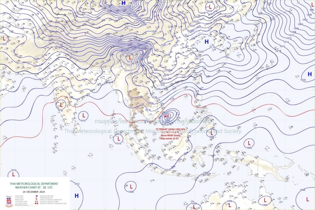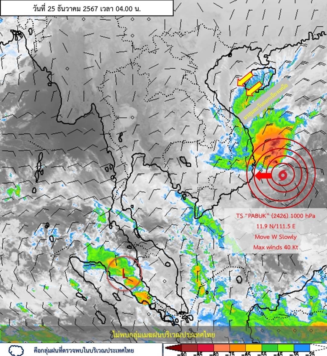 อนึ่ง พายุโซนร้อน “ปาบึก” บริเวณทะเลจีนใต้ตอนล่าง คาดว่าจะเคลื่อนเข้าใกล้ชายฝั่งด้านตะวันออกของประเทศเวียดนามในช่วงวันที่ 25-26 ธ.ค. 67 หลังจากนั้นจะอ่อนกำลังลงเป็นหย่อมความกดอากาศต่ำในระยะต่อไป โดยพายุนี้ไม่มีผลกระทบต่อลักษณะอากาศของประเทศไทยโดยตรง ขอให้ผู้ที่จะเดินทางไปบริเวณดังกล่าว ตรวจสอบสภาพอากาศก่อนออกเดินทางในช่วงวันดังกล่าวไว้ด้วย