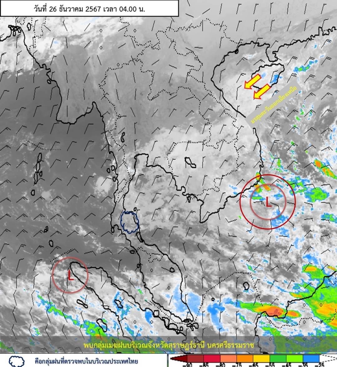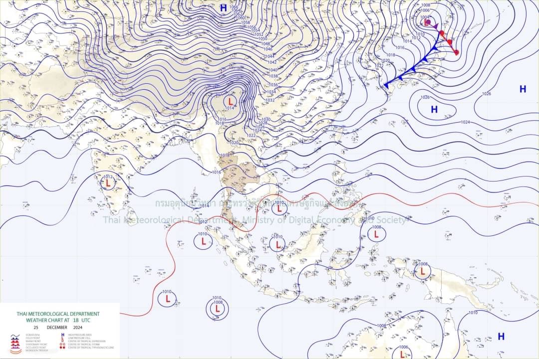 ลักษณะอากาศทั่วไป พยากรณ์อากาศ 24 ชั่วโมงข้างหน้า บริเวณความกดอากาศสูงหรือมวลอากาศกำลังปานกลางปกคลุมประเทศไทยตอนบน ทำให้ภาคเหนือและภาคตะวันออกเฉียงเหนือมีอากาศเย็นถึงหนาว กับมีหมอกในตอนเช้า ส่วนภาคกลาง รวมทั้งกรุงเทพมหานครและปริมณฑล ภาคตะวันออก และภาคใต้ตอนบนมีอากาศเย็นกับมีหมอกบางในตอนเช้า สำหรับบริเวณยอดดอยและยอดภูมีอากาศหนาวถึงหนาวจัดและมีน้ำค้างแข็งบางพื้นที่ ในขณะที่ลมตะวันออกและลมตะวันออกเฉียงใต้พัดนำความชื้นจากทะเลจีนใต้และอ่าวไทยเข้ามาปกคลุมภาคตะวันออกเฉียงเหนือตอนล่าง และภาคตะวันออก ลักษณะเช่นนี้ทำให้บริเวณดังกล่าวมีฝนเล็กน้อยบางพื้นที่ ขอให้ประชาชนในบริเวณประเทศไทยตอนบนดูแลรักษาสุขภาพเนื่องจากสภาพอากาศที่เปลี่ยนแปลง รวมทั้งเพิ่มความระมัดระวังในการสัญจรผ่านบริเวณที่มีหมอก สำหรับเกษตรกรควรเตรียมการป้องกันและระวังความเสียหายที่จะเกิดต่อผลผลิตทางการเกษตรไว้ด้วย