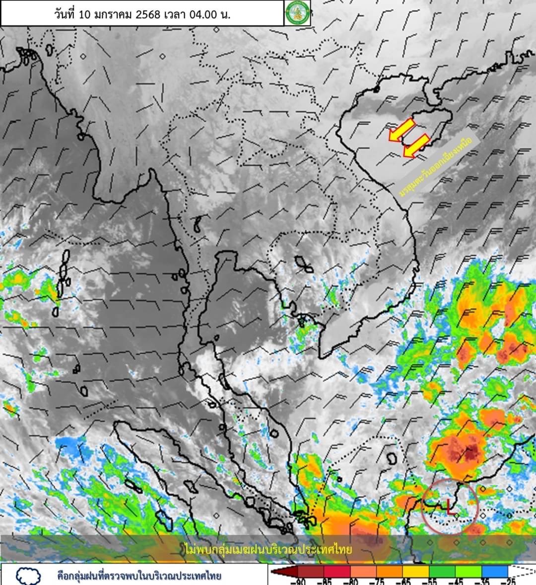 ลักษณะอากาศทั่วไป พยากรณ์อากาศ 24 ชั่วโมงข้างหน้า บริเวณความกดอากาศสูงหรือมวลอากาศเย็นกำลังแรงอีกระลอกหนึ่งจากประเทศจีน ได้แผ่ลงมาปกคลุมภาคตะวันออกเฉียงเหนือตอนบนแล้ว คาดว่าจะแผ่ลงมาปกคลุมถึงภาคตะวันออกเฉียงเหนือตอนล่างในวันนี้ (10 ม.ค. 68) และจะแผ่ปกคลุมประเทศไทยตอนบนในระยะถัดไป ลักษณะเช่นนี้ทำให้ภาคตะวันออกเฉียงเหนือมีอุณหภูมิลดลงกับมีลมแรง โดยบริเวณภาคเหนือยังคงมีอากาศเย็นถึงหนาวกับมีหมอกในตอนเช้า ส่วนภาคกลาง รวมทั้งกรุงเทพมหานครและปริมณฑล ภาคตะวันออก และภาคใต้ตอนบนมีอากาศเย็นในตอนเช้า สำหรับบริเวณยอดดอยและยอดภูมีอากาศหนาวถึงหนาวจัด ขอให้ประชาชนบริเวณประเทศไทยตอนบน และภาคใต้ตอนบนดูแลรักษาสุขภาพเนื่องจากสภาพอากาศที่หนาวเย็น และระวังอันตรายจากอัคคีภัยที่อาจจะเกิดขึ้นเนื่องจากอากาศแห้ง รวมทั้งระมัดระวังในการสัญจรผ่านบริเวณที่มีหมอกไว้ด้วย สำหรับมรสุมตะวันออกเฉียงเหนือที่พัดปกคลุมอ่าวไทย ภาคใต้ และทะเลอันดามัน เริ่มมีกำลังแรงขึ้น ทำให้ภาคใต้มีฝนเพิ่มขึ้น ส่วนคลื่นลมบริเวณอ่าวไทยมีกำลังปานกลางโดยมีคลื่นสูงประมาณ 2 เมตร บริเวณที่มีฝนฟ้าคะนองคลื่นสูงมากกว่า 2 เมตร ขอให้ชาวเรือในบริเวณดังกล่าว เดินเรือด้วยความระมัดระวังและหลีกเลี่ยงการเดินเรือในบริเวณที่มีฝนฟ้าคะนองไว้ด้วย