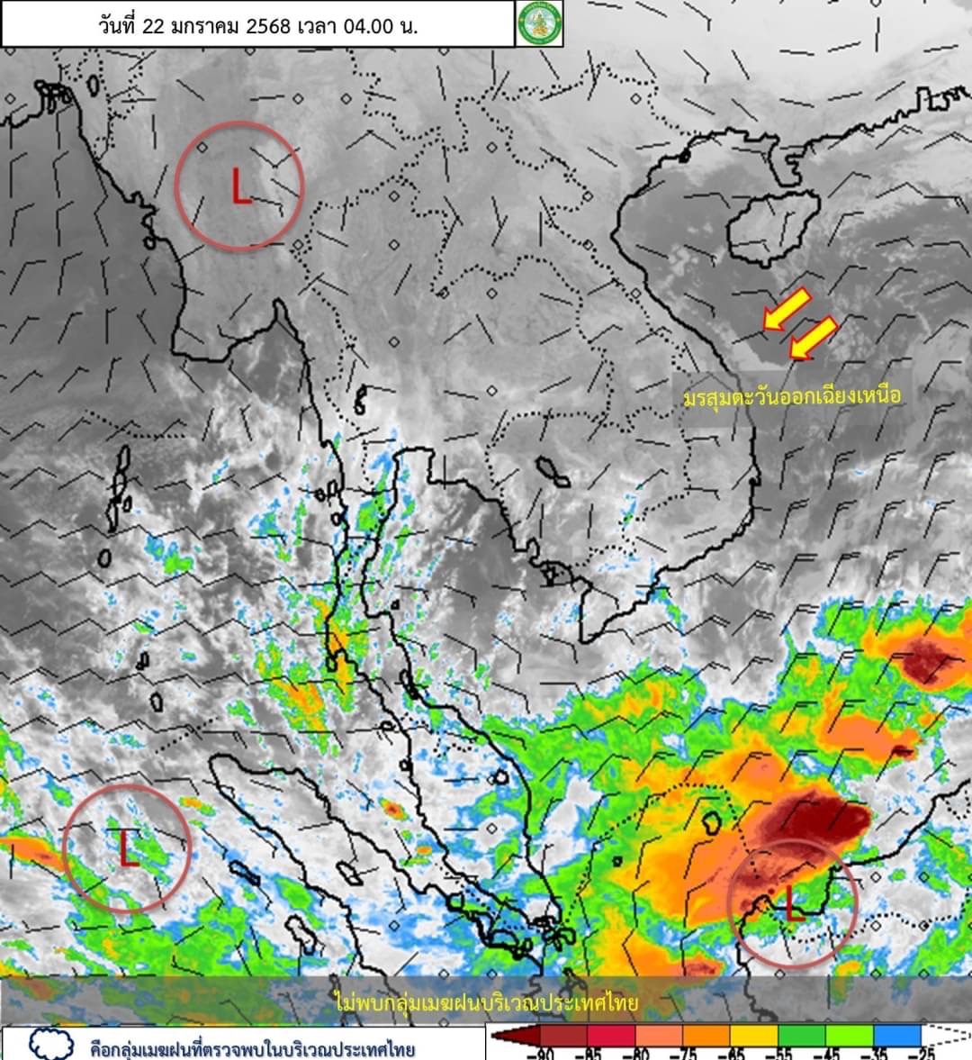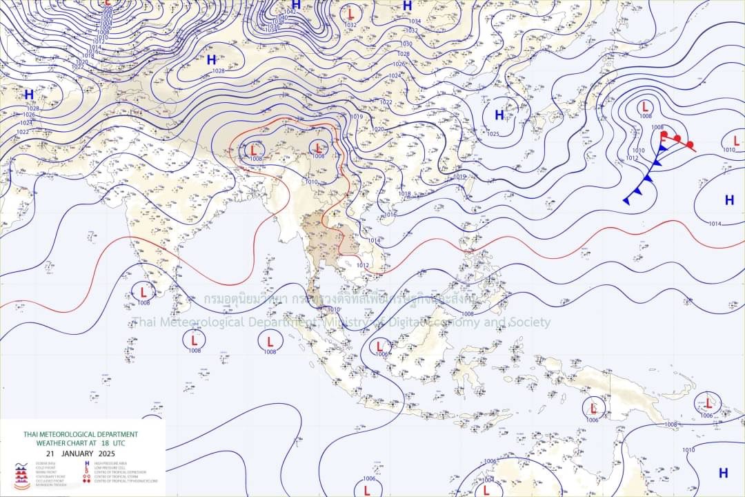 ลักษณะอากาศทั่วไป พยากรณ์อากาศ 24 ชั่วโมงข้างหน้า บริเวณความกดอากาศสูงหรือมวลอากาศเย็นยังคงปกคลุมประเทศไทยตอนบนและทะเลจีนใต้ ลักษณะเช่นนี้ทำให้บริเวณดังกล่าวมีหมอกในตอนเช้า และอุณหภูมิจะสูงขึ้นเล็กน้อย โดยภาคเหนือ และภาคตะวันออกเฉียงเหนือ มีอากาศเย็นถึงหนาว ส่วนภาคกลาง รวมทั้งกรุงเทพมหานครและปริมณฑล ภาคตะวันออก และภาคใต้ตอนบนมีอากาศเย็นในตอนเช้า สำหรับบริเวณยอดดอยและยอดภูมีอากาศหนาวถึงหนาวจัด และมีน้ำค้างแข็งบางแห่งบริเวณยอดดอย ขอให้ประชาชนบริเวณประเทศไทยดูแลรักษาสุขภาพเนื่องจากสภาพอากาศที่ยังคงหนาวเย็น และระวังอันตรายจากอัคคีภัยที่อาจจะเกิดขึ้นเนื่องจากอากาศแห้ง รวมทั้งเพิ่มความระมัดระวังในการสัญจรผ่านบริเวณที่มีหมอกไว้ด้วย