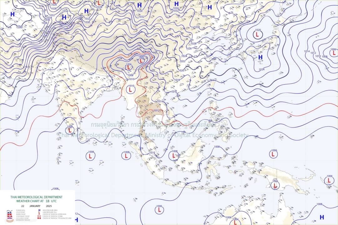อนึ่ง ในวันที่ 26 – 28 ม.ค. 68 บริเวณความกดอากาศสูงหรือมวลอากาศเย็นกำลังข้างแรงอีกระลอกจากประเทศจีนจะแผ่เสริมลงมาปกคลุมประเทศไทยและทะเลจีนใต้ ทำให้ประเทศไทยมีอากาศหนาวเย็นลงกับมีลมแรง สำหรับมรสุมตะวันออกเฉียงเหนือที่พัดปกคลุมอ่าวไทยและภาคใต้จะมีกำลังแรงขึ้น ทำให้ภาคใต้มีฝนเพิ่มขึ้นและมีฝนตกหนักบางแห่งบริเวณตอนล่างของภาค ส่วนคลื่นลมบริเวณอ่าวไทยและทะเลอันดามันมีกำลังแรงขึ้น โดยอ่าวไทยตอนล่างมีคลื่นสูง 2 – 3 เมตร บริเวณที่มีฝนฟ้าคะนองคลื่นสูงมากกว่า 3 เมตร