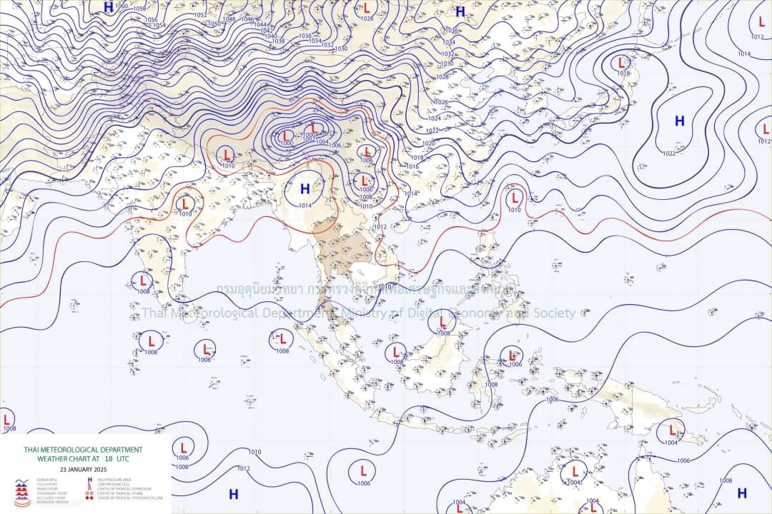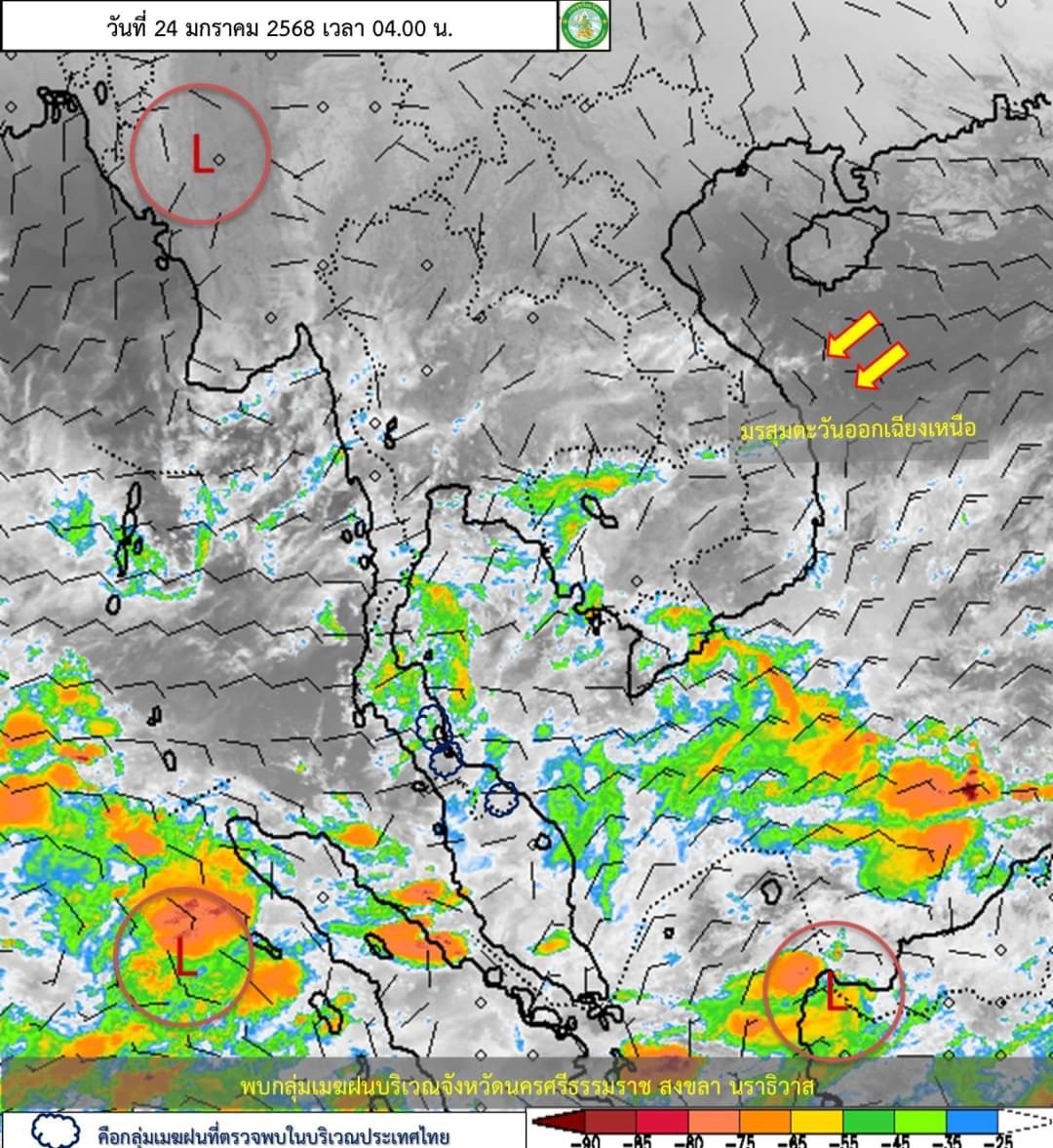 อนึ่ง ในช่วงวันที่ 26-28 ม.ค. 68 บริเวณความกดอากาศสูงหรือมวลอากาศเย็นกำลังค่อนข้างแรงระลอกใหม่จากประเทศจีนจะแผ่ลงมาปกคลุมประเทศไทยตอนบน และทะเลจีนใต้ ทำให้ประเทศไทยมีอากาศหนาวเย็นลงกับมีลมแรง โดยภาคตะวันออกเฉียงเหนืออุณหภูมิจะลดลง 3–5 องศาเซลเซียส ส่วนภาคเหนือ ภาคกลาง รวมทั้งกรุงเทพมหานครและปริมณฑล ภาคตะวันออก และภาคใต้ตอนบน อุณหภูมิจะลดลง 2–4 องศาเซลเซียส สำหรับมรสุมตะวันออกเฉียงเหนือที่พัดปกคลุมอ่าวไทย ภาคใต้ และทะเลอันดามันมีกำลังแรงขึ้น ทำให้ภาคใต้ตอนล่างมีฝนเพิ่มขึ้นและมีฝนตกหนักบางแห่ง ส่วนคลื่นลมบริเวณอ่าวไทยและทะเลอันดามันมีกำลังแรงขึ้น โดยอ่าวไทยตอนล่างมีคลื่นสูง 2–3 เมตร บริเวณที่มีฝนฟ้าคะนองคลื่นสูงมากกว่า 3 เมตร ส่วนอ่าวไทยตอนบนมีคลื่นสูงประมาณ 2 เมตร บริเวณที่มีฝนฟ้าคะนองคลื่นสูงมากกว่า 2 เมตร