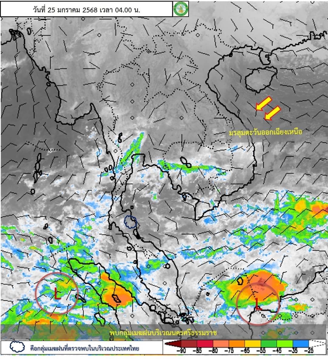 อนึ่ง ในช่วงวันที่ 26-28 ม.ค. 68 บริเวณความกดอากาศสูงหรือมวลอากาศเย็นกำลังค่อนข้างแรงระลอกใหม่จากประเทศจีนจะแผ่ลงมาปกคลุมประเทศไทยตอนบน และทะเลจีนใต้ ทำให้ประเทศไทยมีอากาศหนาวเย็นลงกับมีลมแรง โดยภาคตะวันออกเฉียงเหนืออุณหภูมิจะลดลง 3–5 องศาเซลเซียส ส่วนภาคเหนือ ภาคกลาง รวมทั้งกรุงเทพมหานครและปริมณฑล ภาคตะวันออก และภาคใต้ตอนบน อุณหภูมิจะลดลง 2–4 องศาเซลเซียส สำหรับมรสุมตะวันออกเฉียงเหนือที่พัดปกคลุมอ่าวไทย ภาคใต้ และทะเลอันดามันมีกำลังแรงขึ้น ทำให้ภาคใต้ตอนล่างมีฝนเพิ่มขึ้นและมีฝนตกหนักบางแห่ง ส่วนคลื่นลมบริเวณอ่าวไทยและทะเลอันดามันมีกำลังแรงขึ้น โดยอ่าวไทยตอนล่างมีคลื่นสูง 2–3 เมตร บริเวณที่มีฝนฟ้าคะนองคลื่นสูงมากกว่า 3 เมตร ส่วนอ่าวไทยตอนบนมีคลื่นสูงประมาณ 2 เมตร บริเวณที่มีฝนฟ้าคะนองคลื่นสูงมากกว่า 2 เมตร