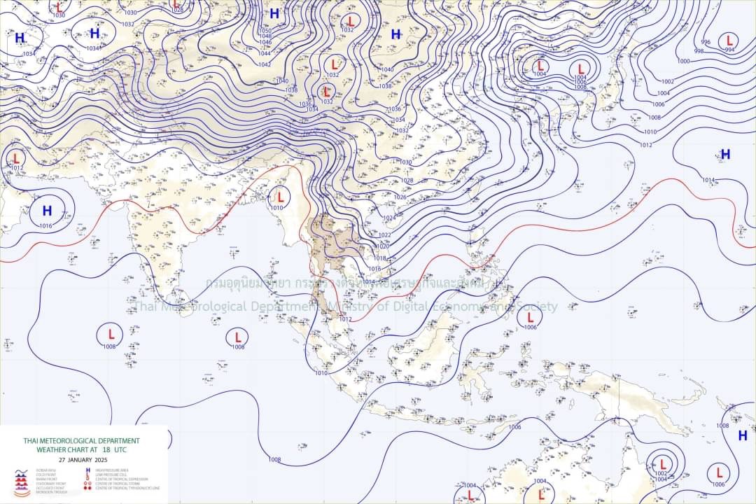 ลักษณะอากาศทั่วไป พยากรณ์อากาศ 24 ชั่วโมงข้างหน้า ประเทศไทยตอนบนมีอากาศหนาวเย็นลงกับมีลมแรง อุณหภูมิจะลดลง 1–2 องศาเซลเซียส ขอให้ประชาชนในบริเวณดังกล่าวดูแลรักษาสุขภาพเนื่องจากสภาพอากาศที่หนาวเย็นลง รวมทั้งระวังอันตรายจากอัคคีภัยเนื่องจากสภาพอากาศแห้งและลมแรง ทั้งนี้เนื่องจากบริเวณความกดอากาศสูงหรือมวลอากาศเย็นกำลังค่อนข้างแรงระลอกใหม่จากประเทศจีนแผ่ปกคลุมประเทศไทยตอนบน