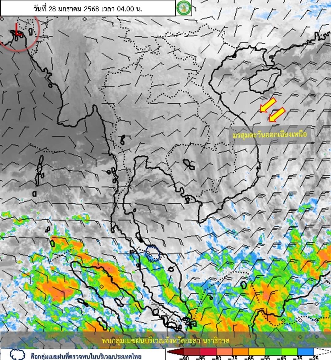 สำหรับมรสุมตะวันออกเฉียงเหนือที่พัดปกคลุมอ่าวไทยและภาคใต้มีกำลังค่อนข้างแรง ทำให้ภาคใต้มีฝนฟ้าคะนองเกิดขึ้น ส่วนคลื่นลมบริเวณอ่าวไทยและทะเลอันดามันมีกำลังแรงขึ้น โดยอ่าวไทยตอนล่างมีคลื่นสูง 2–3 เมตร บริเวณที่มีฝนฟ้าคะนองคลื่นสูงมากกว่า 3 เมตร อ่าวไทยตอนบนมีคลื่นสูงประมาณ 2 เมตร ทะเลอันดามันมีคลื่นสูง 1-2 เมตร ห่างฝั่งและบริเวณที่มีฝนฟ้าคะนองคลื่นสูงมากกว่า 2 เมตร ขอให้ประชาชนบริเวณภาคใต้ฝั่งตะวันออกระวังอันตรายจากคลื่นที่ซัดเข้าหาฝั่ง ส่วนชาวเรือบริเวณอ่าวไทยและทะเลอันดามันควรเดินเรือด้วยความระมัดระวังและหลีกเลี่ยงการเดินเรือในบริเวณที่มีฝนฟ้าคะนอง สำหรับเรือเล็กบริเวณอ่าวไทยควรงดออกจากฝั่ง จนถึงวันที่ 28 ม.ค. 68