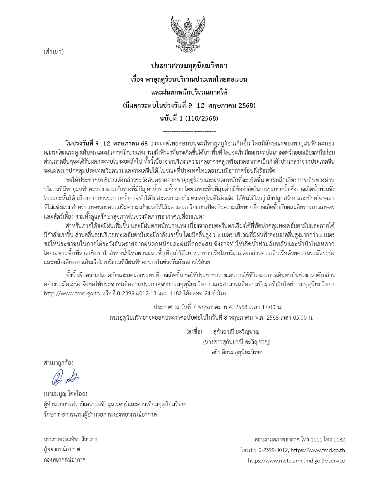กรมอุตุนิยมวิทยาจะออกประกาศฉบับต่อไปในวันที่ 8 พฤษภาคม พ.ศ. 2568 เวลา 05.00 น.