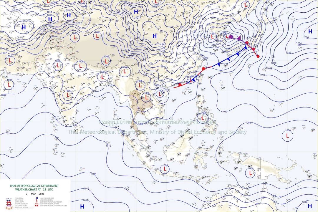 ลักษณะอากาศทั่วไป พยากรณ์อากาศ 24 ชั่วโมงข้างหน้า ภาคตะวันออกเฉียงเหนือจะมีพายุฤดูร้อนเกิดขึ้น โดยมีลักษณะของพายุฝนฟ้าคะนอง ลมกระโชกแรง และลูกเห็บตกบางแห่ง รวมถึงฟ้าผ่าที่อาจเกิดขึ้นได้บางพื้นที่ ส่วนภาคอื่นๆ จะได้รับผลกระทบในระยะถัดไป ทั้งนี้เนื่องจากบริเวณความกดอากาศสูงกำลังปานกลางจากประเทศจีนแผ่ลงมาปกคลุมประเทศเวียดนามและทะเลจีนใต้ ส่งผลทำให้มีลมตะวันออกเฉียงใต้และลมใต้พัดนำความชื้นจากอ่าวไทย และทะเลจีนใต้เข้าปกคลุมประเทศไทยตอนบน ในขณะที่ประเทศไทยตอนบนมีอากาศร้อนถึงร้อนจัด ขอให้ประชาชนบริเวณดังกล่าวระวังอันตรายจากพายุฤดูร้อนที่จะเกิดขึ้น ควรหลีกเลี่ยงการเดินทางผ่านบริเวณที่มีพายุฝนฟ้าคะนอง และไม่ควรอยู่ในที่โล่งแจ้ง ใต้ต้นไม้ใหญ่ สิ่งปลูกสร้าง และป้ายโฆษณาที่ไม่แข็งแรง สำหรับเกษตรกรควรเสริมความแข็งแรงให้ไม้ผล และเตรียมการป้องกันความเสียหายที่อาจเกิดขึ้นกับผลผลิตทางการเกษตรและสัตว์เลี้ยง