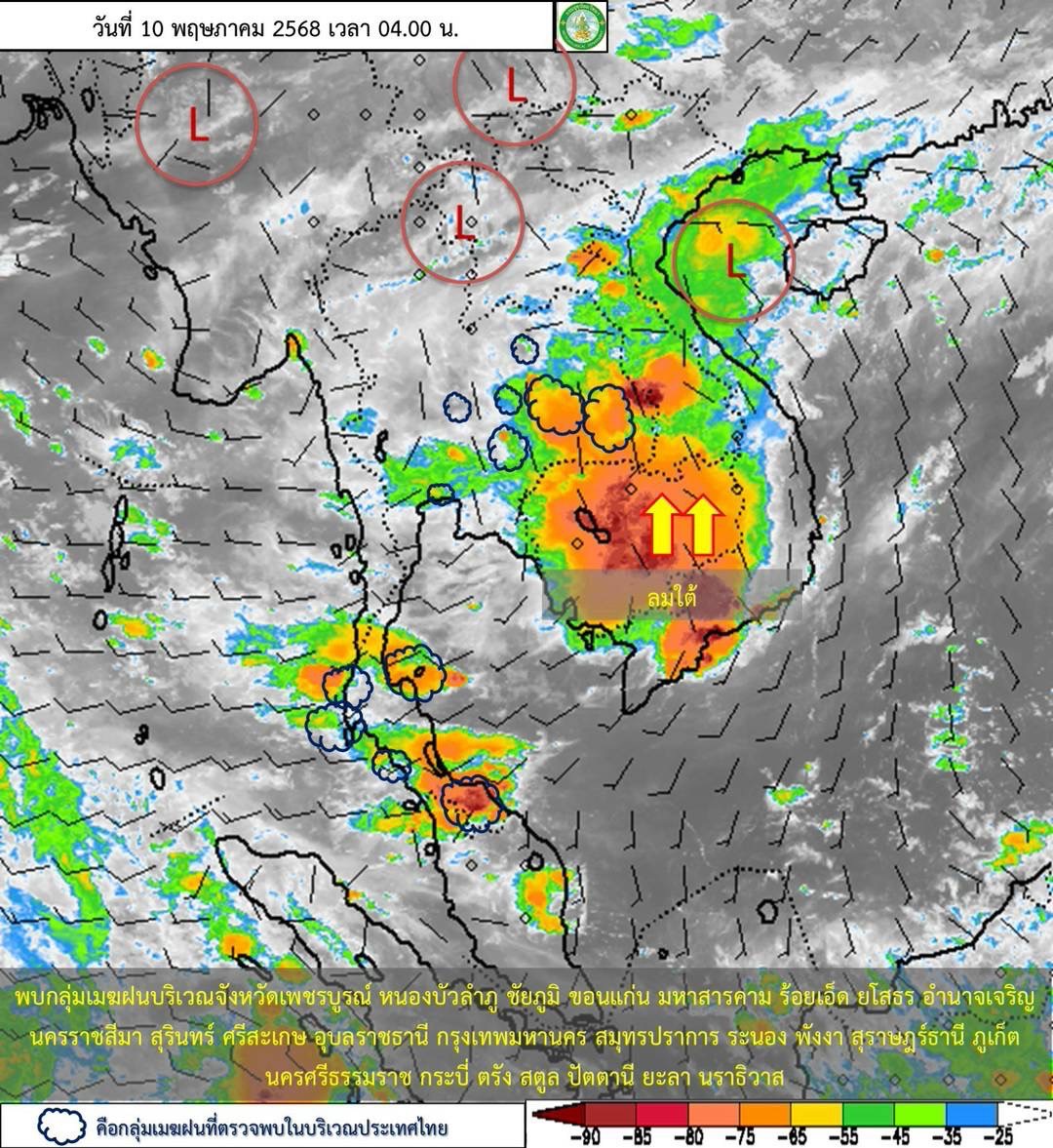 สำหรับภาคใต้จะมีฝนเพิ่มขึ้นและมีฝนตกหนักบางแห่ง ขอให้ประชาชนในบริเวณดังกล่าวระวังอันตรายจากฝนฟ้าคะนอง ทั้งนี้เนื่องจากลมตะวันตกและลมตะวันตกเฉียงใต้พัดปกคลุมทะเลอันดามัน ภาคใต้ และอ่าวไทย เริ่มมีกำลังแรงขึ้น ส่วนบริเวณอ่าวไทยและทะเลอันดามันมีคลื่นสูงประมาณ 1 เมตร บริเวณที่มีฝนฟ้าคะนองคลื่นสูงมากกว่า 2 เมตร ขอให้ชาวเรือบริเวณอ่าวไทย และทะเลอันดามันหลีกเลี่ยงการเดินเรือในบริเวณที่มีฝนฟ้าคะนองไว้ด้วย