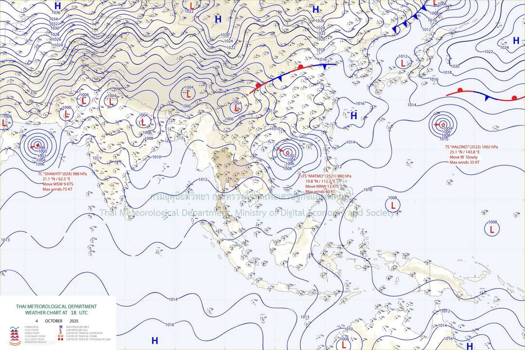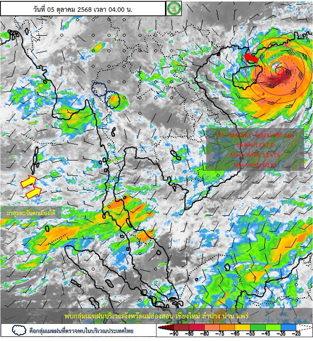 อนึ่ง พายุโซนร้อนกำลังแรง “แมตโม” (MATMO) บริเวณทะเลจีนใต้ตอนบนได้ทวีกำลังขึ้นเป็นพายุไต้ฝุ่นแล้ว โดยกำลังเคลื่อนตัวทางทิศตะวันตกค่อนทางเหนือเล็กน้อย และคาดว่าจะเคลื่อนขึ้นฝั่งบริเวณมณฑลกวางตุ้ง ทางตอนใต้ของประเทศจีนในวันนี้ (5 ต.ค. 68) หลังจากนั้นจะอ่อนกำลังลงอย่างรวดเร็วตามลำดับ โดยพายุนี้ไม่เคลื่อนเข้าสู่ประเทศไทย