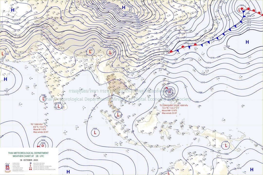 อนึ่ง พายุโซนร้อน “เฟิงเฉิน” บริเวณเกาะลูซอน ประเทศฟิลิปปินส์ คาดว่าจะเคลื่อนลงสู่ทะเลจีนใต้ตอนบนในวันนี้ (19 ต.ค.) หลังจากนั้นในช่วงวันที่ 21 – 23 ต.ค.พายุนี้จะเคลื่อนเข้าใกล้ตอนใต้ของเกาะไหหลำ ประเทศจีน และชายฝั่งประเทศเวียดนามตอนกลาง ในขณะที่บริเวณความกดอากาศสูงจากประเทศจีนจะแผ่ลงมาปกคลุมประเทศจีนตอนใต้ และประเทศเวียดนามตอนบน โดยพายุนี้ไม่เคลื่อนเข้าสู่ประเทศไทย แต่จะส่งผลทำให้ภาคตะวันออกเฉียงเหนือมีฝนบางแห่ง และลมตะวันออกเฉียงเหนือที่พัดปกคลุมในบริเวณดังกล่าวมีกำลังแรงขึ้น
