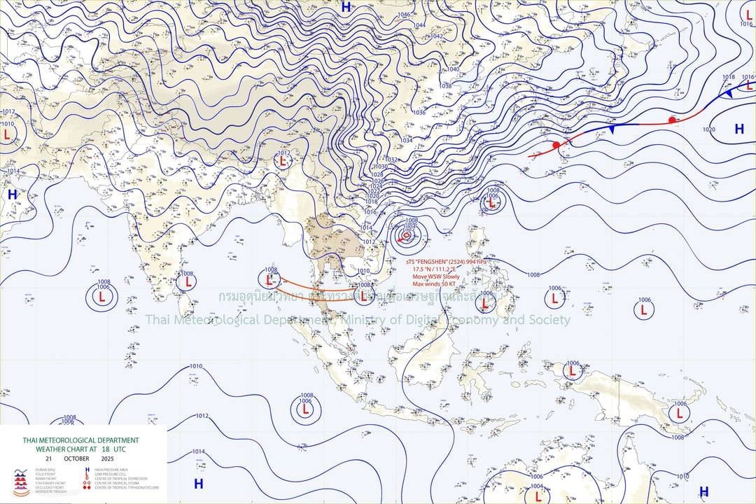 อนึ่ง พายุโซนร้อน “เฟิงเฉิน” บริเวณทะเลจีนใต้ตอนบน ได้ทวีกำลังแรงขึ้นเป็นพายุโซนร้อนกำลังแรงแล้ว คาดว่าจะเคลื่อนขึ้นฝั่งบริเวณประเทศเวียดนามตอนกลางในช่วงวันที่ 22-23 ต.ค. 68 หลังจากนั้นจะอ่อนกำลังลงอย่างรวดเร็วตามลำดับ เนื่องจากมีมวลอากาศเย็นจากประเทศจีนแผ่ลงมาปกคลุมประเทศเวียดนามตอนบนและทะเลจีนใต้ตอนบน ในช่วงวันดังกล่าว โดยพายุนี้ไม่เคลื่อนเข้าสู่ประเทศไทย