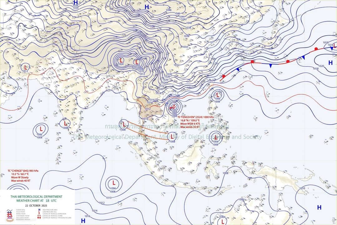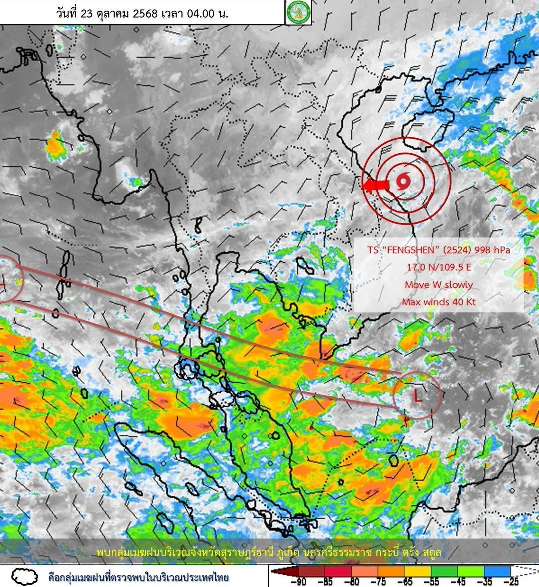 อนึ่ง พายุโซนร้อน “เฟิงเฉิน” (FENGSHEN) บริเวณทะเลจีนใต้ตอนบน คาดว่าจะเคลื่อนขึ้นฝั่งบริเวณประเทศเวียดนามตอนกลางในวันนี้ (23 ต.ค. 68) พายุนี้จะอ่อนกำลังลงอย่างรวดเร็ว โดยไม่เคลื่อนเข้าสู่ประเทศไทย เนื่องจากมีมวลอากาศเย็นจากประเทศจีนแผ่ลงมาปกคลุมประเทศเวียดนามตอนบนและทะเลจีนใต้ตอนบน