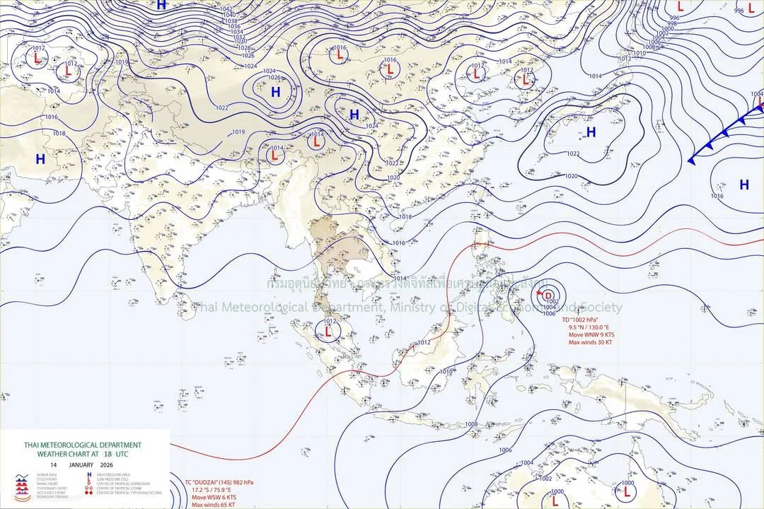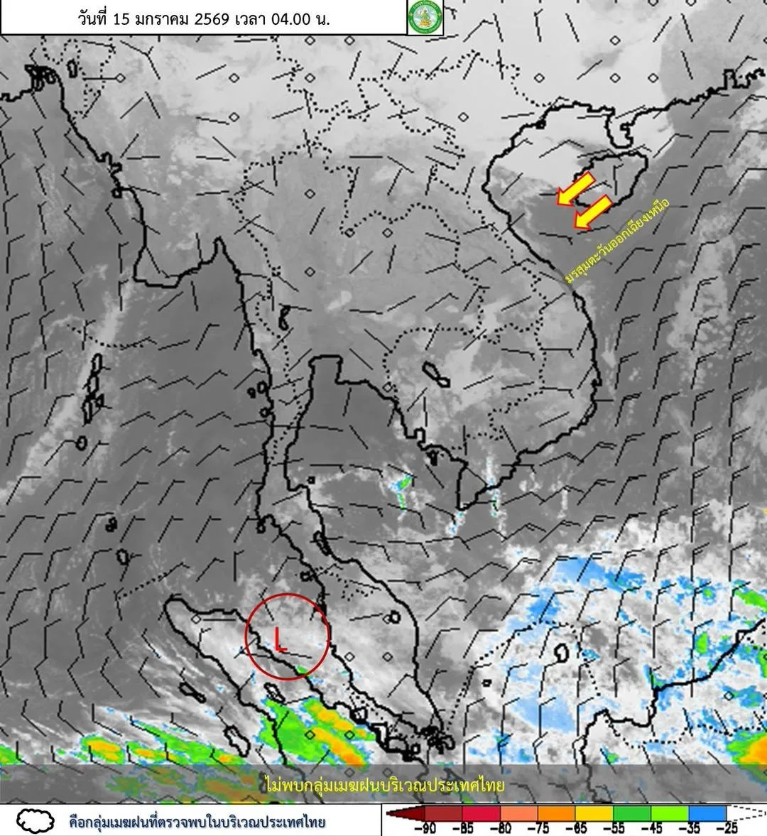 ลักษณะอากาศทั่วไป พยากรณ์อากาศ 24 ชั่วโมงข้างหน้า ประเทศไทยมีอุณหภูมิสูงขึ้น 1-3 องศาเซลเซียส กับมีหมอกในตอนเช้า และมีหมอกหนาบางพื้นที่ แต่ยังคงมีอากาศเย็นถึงหนาวในภาคเหนือ และภาคตะวันออกเฉียงเหนือ เนื่องจากบริเวณความกดอากาศสูงหรือมวลอากาศเย็นที่ปกคลุมประเทศไทยมีกำลังอ่อนลง ขอให้ประชาชนดูแลรักษาสุขภาพเนื่องจากสภาพอากาศที่เปลี่ยนแปลง ระมัดระวังการเดินทางผ่านบริเวณที่มีหมอกและระวังอันตรายจากอัคคีภัยเนื่องจากสภาพอากาศแห้งไว้ด้วย