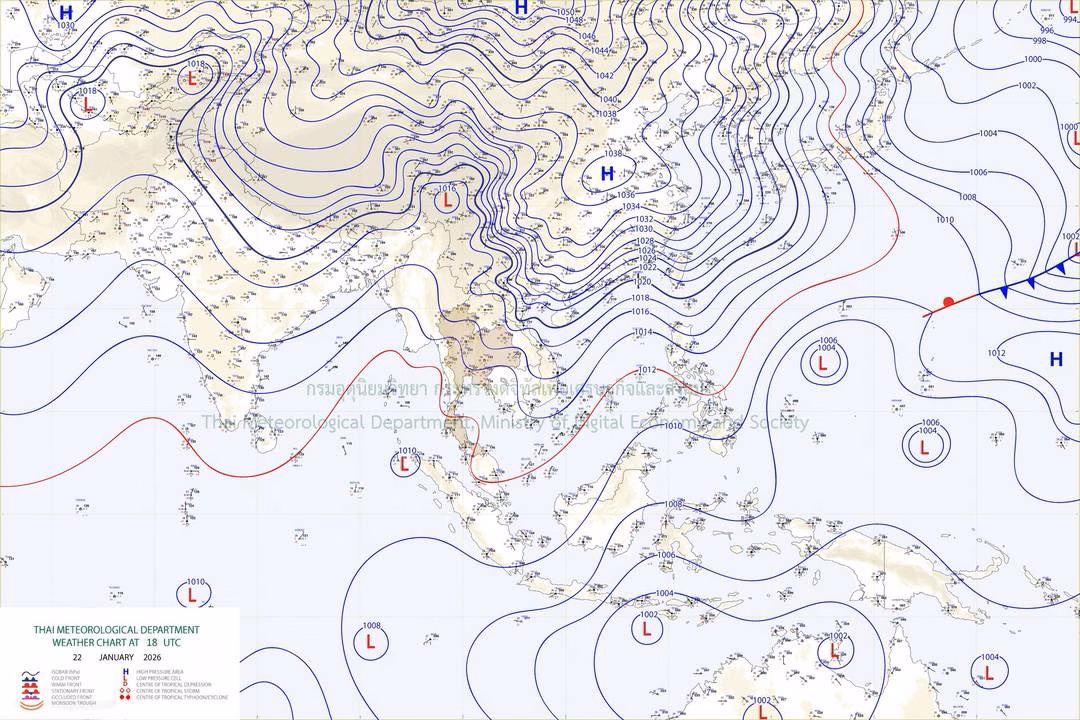 ลักษณะอากาศทั่วไป พยากรณ์อากาศ 24 ชั่วโมงข้างหน้า ประเทศไทยตอนบน และภาคใต้ตอนบนจะมีอุณหภูมิลดลง กับมีลมแรง โดยภาคตะวันออกเฉียงเหนืออุณหภูมิจะลดลง 1-3 องศาเซลเซียส ส่วนภาคเหนือ ภาคกลาง รวมทั้งกรุงเทพมหานครและปริมณฑล ภาคตะวันออก และภาคใต้ตอนบน อุณหภูมิจะลดลง 1-2 องศาเซลเซียส เนื่องจากบริเวณความกดอากาศสูงหรือมวลอากาศเย็นกำลังปานกลางระลอกใหม่จากประเทศจีนได้แผ่ปกคลุมประเทศไทยตอนบนแล้ว ในขณะที่ภาคกลางตอนล่างมีฝนบางแห่ง เนื่องจากมีลมตะวันออกพัดปกคลุมในบริเวณดังกล่าว ขอให้ประชาชนดูแลรักษาสุขภาพเนื่องจากสภาพอากาศที่เปลี่ยนแปลง