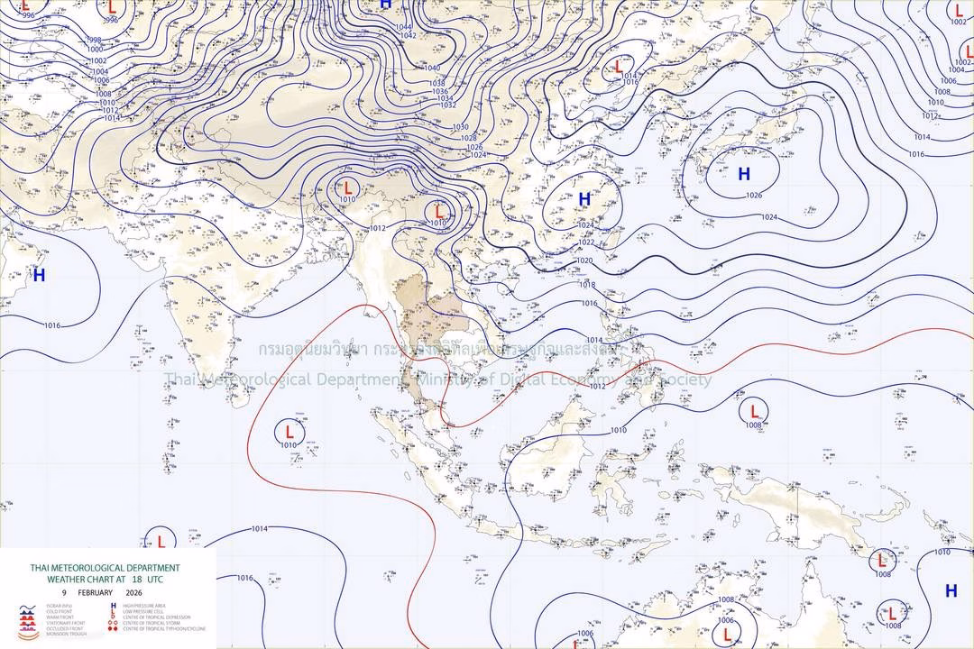 ลักษณะอากาศทั่วไป พยากรณ์อากาศ 24 ชั่วโมงข้างหน้า ประเทศไทยตอนบนยังคงมีอากาศเย็นในตอนเช้า โดยมีฝนเล็กน้อยบางแห่งในภาคเหนือ เนื่องจากบริเวณความกดอากาศสูงหรือมวลอากาศเย็นกำลังปานกลางถึงค่อนข้างแรงจากประเทศจีนปกคลุมประเทศไทยตอนบน และทะเลจีนใต้ ในขณะที่มีลมตะวันออกเฉียงใต้พัดปกคลุมภาคเหนือ ขอให้ประชาชนบริเวณประเทศไทยตอนบนดูแลรักษาสุขภาพเนื่องจากสภาพอากาศที่เปลี่ยนแปลง ส่วนเกษตรกรในภาคเหนือควรเตรียมการป้องกันและระวังความเสียหายที่จะเกิดต่อผลผลิตทางการเกษตร เนื่องจากยังคงมีฝนในบางพื้นที่