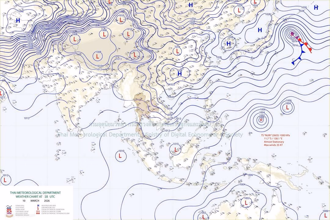 อนึ่ง ในช่วงวันที่ 12-13 มี.ค. 69 ความกดอากาศสูงหรือมวลอากาศเย็นกำลังปานกลางอีกระลอกหนึ่งจากประเทศจีนเคลื่อนเข้าปกคลุมภาคตะวันออกเฉียงเหนือ ภาคตะวันออก และทะเลจีนใต้ ในขณะที่ประเทศไทยตอนบนมีอากาศร้อน จะทำให้บริเวณประเทศไทยตอนบนมีพายุฝนฟ้าคะนอง ลมกระโชกแรง ลูกเห็บตก รวมถึงฟ้าผ่าที่อาจเกิดขึ้นได้บางพื้นที่
