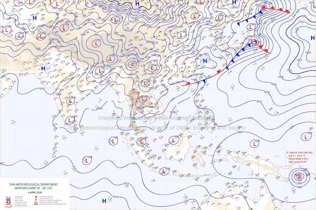 ลักษณะอากาศทั่วไป พยากรณ์อากาศ 24 ชั่วโมงข้างหน้า ประเทศไทยตอนบนมีอากาศร้อนโดยทั่วไปและมีอากาศร้อนจัดบางพื้นที่ กับมีฟ้าหลัวในตอนกลางวัน ส่วนภาคใต้มีอากาศร้อน เนื่องจากความกดอากาศต่ำเนื่องจากความร้อนปกคลุมประเทศไทยตอนบน ในขณะที่มีลมใต้และลมตะวันตกเฉียงใต้กำลังอ่อนพัดปกคลุมในบริเวณดังกล่าว ทำให้ประเทศไทยมีฝนน้อย ขอให้ประชาชน ดูแลรักษาสุขภาพเนื่องจากสภาพอากาศที่ร้อนถึงร้อนจัด โดยหลีกเลี่ยงการทำงานหรือการประกอบกิจกรรมในที่โล่งแจ้งเป็นระยะเวลานาน รวมทั้งระวังอันตรายจากฝนฟ้าคะนองที่อาจเกิดขึ้นได้บางพื้นที่ไว้ด้วย
