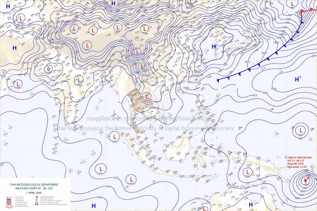 ลักษณะอากาศทั่วไป พยากรณ์อากาศ 24 ชั่วโมงข้างหน้า ประเทศไทยตอนบนมีอากาศร้อนโดยทั่วไปและมีอากาศร้อนจัดบางพื้นที่ กับมีฟ้าหลัวในตอนกลางวัน เนื่องจากความกดอากาศต่ำ เนื่องจากความร้อนปกคลุมประเทศไทยตอนบน ในขณะที่มีลมใต้ และลมตะวันตกเฉียงใต้กำลังอ่อนพัดปกคลุมในบริเวณดังกล่าว ทำให้ประเทศไทยตอนบนมีฝนฟ้าคะนองเล็กน้อยบางพื้นที่ กับมีลมกระโชกแรงบางแห่ง ส่วนมากทางภาคเหนือ ขอให้ประชาชนดูแลรักษาสุขภาพเนื่องจากสภาพอากาศที่ร้อนถึงร้อนจัด โดยหลีกเลี่ยงการทำงานหรือการประกอบกิจกรรมในที่โล่งแจ้งเป็นระยะเวลานาน รวมทั้งระวังอันตรายจากฝนฟ้าคะนองที่อาจเกิดขึ้นได้บางพื้นที่ไว้ด้วย