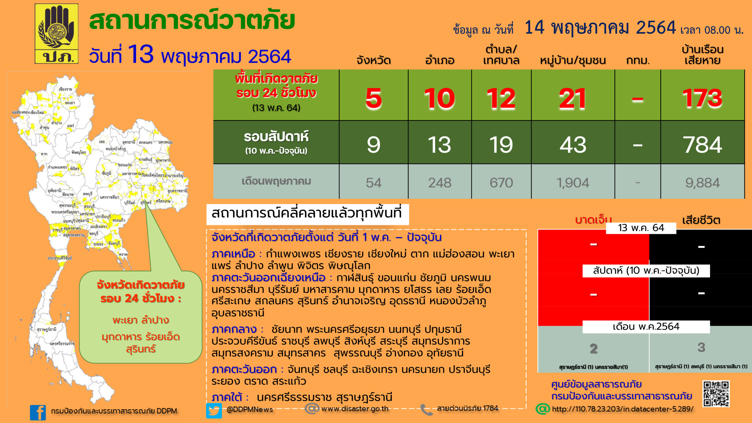 วันที่ 14 พ.ค. 64 เวลา 09.20 น. รายงานในรอบ 24 ชม. ที่ผ่านมาเกิดวาตภัยในพื้นที่ 5 จังหวัด ได้แก่ พะเยา ลำปาง มุกดาหาร ร้อยเอ็ด และสุรินทร์ รวม 10 อำเภอ 12 ตำบล 21 หมู่บ้าน บ้านเรือนเสียหาย 173 หลัง ส่วนในรอบสัปดาห์ ระหว่างวันที่ 10 – 14 พ.ค. 64 เวลา 06.00 น. มีพื้นที่ประสบวาตภัย 9 จังหวัด 13 อำเภอ 19 ตำบล 43 หมู่บ้านบ้านเรือนเสียหาย 784 หลัง ปัจจุบันสถานการณ์คลี่คลายแล้วทุกจังหวัด ซึ่ง ปภ.ได้ร่วมกับจังหวัดและหน่วยงานที่เกี่ยวข้อง ลงพื้นที่สำรวจความเสียหาย และให้การช่วยเหลือผู้ประสบภัยในเบื้องต้นแล้ว