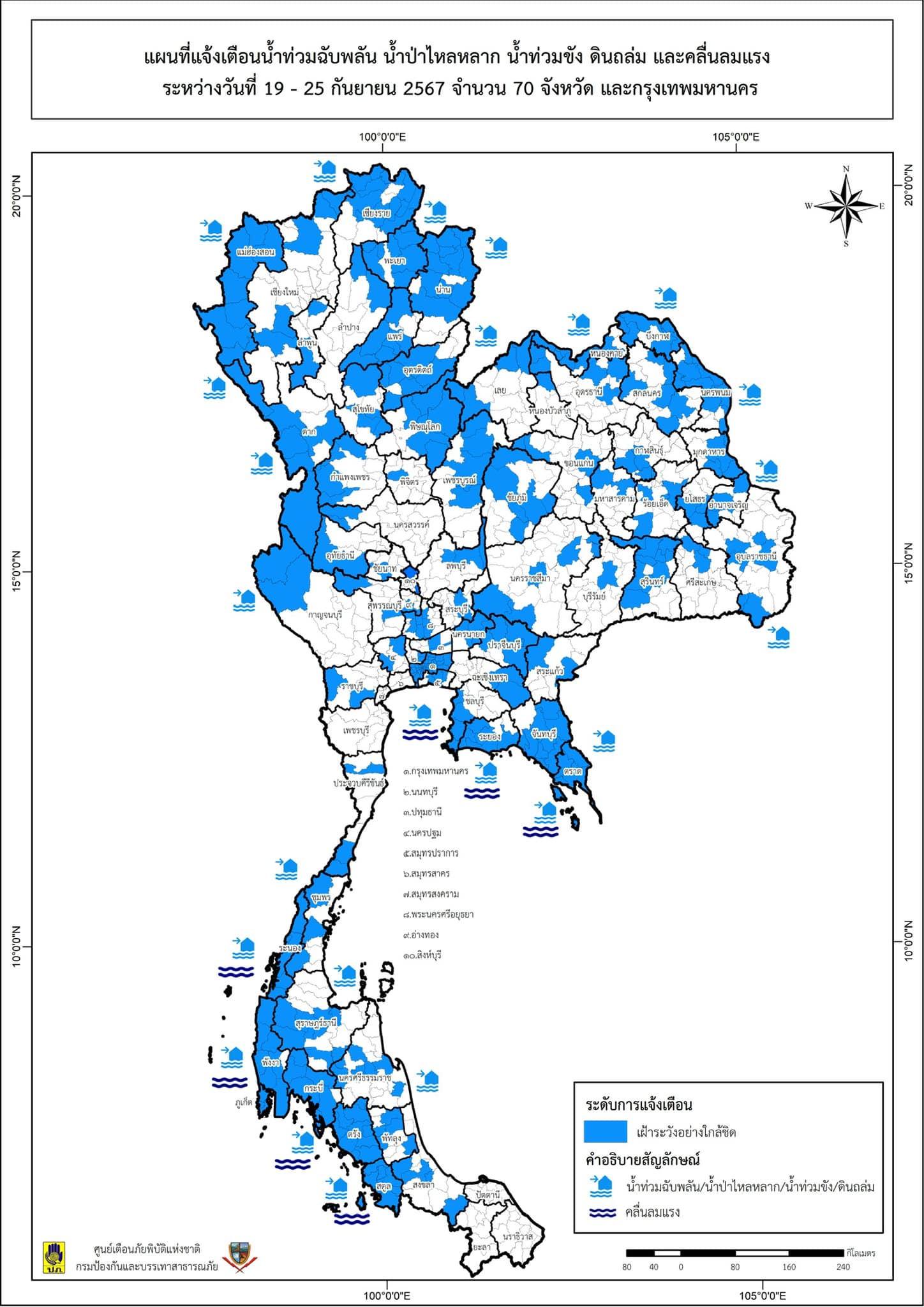 เมื่อวันที่ 20 ก.ย. 67 เวลา 11.45 น. กรมป้องกันและบรรเทาสาธารณภัย (ปภ.) แจ้ง 70 จังหวัดในพื้นที่ภาคเหนือ ภาคตะวันออกเฉียงเหนือ ภาคกลาง ภาคใต้ และ กทม. เฝ้าระวังสถานการณ์น้ำท่วมฉับพลัน น้ำป่าไหลหลาก น้ำท่วมขัง ดินถล่ม น้ำล้นอ่างเก็บน้ำ น้ำล้นตลิ่ง และคลื่นลมแรง ในช่วงวันที่ 19 – 25 ก.ย. 2567 โดยให้จัดเจ้าหน้าที่ติดตามสภาพอากาศ ปริมาณฝน และสถานการณ์น้ำในพื้นที่อย่างใกล้ชิด โดยเฉพาะในบริเวณพื้นที่เสี่ยงและบริเวณที่มีฝนตกสะสม เตรียมความพร้อมด้านบุคลากร อุปกรณ์ และเครื่องจักรกลสาธารณภัยให้สามารถเข้าเผชิญเหตุและช่วยเหลือประชาชนได้อย่างรวดเร็วเมื่อเกิดสถานการณ์ภัยขึ้น รวมถึงแจ้งเตือนประชาชนในพื้นที่เสี่ยงภัยทราบล่วงหน้า และประชาสัมพันธ์ให้ประชาชนปฏิบัติตามประกาศแจ้งเตือนภัยจากทางราชการอย่างเคร่งครัดอย่างเคร่งครัด