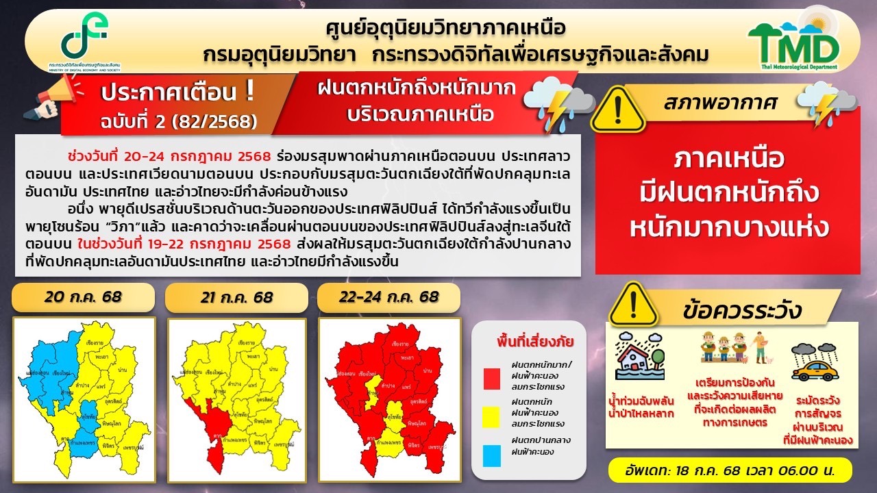 ภาคเหนือของไทย อาจจะส่งผลกระทบให้มีฝนตกหนักในพื้นที่ภาคเหนือ ภาคอีสานตอนบน ภาคกลางด้านตะวันตก รวมทั้งจะทำให้มรสุมมีกำลังแรงในช่วง 22 – 24 ก.ค.68 ยังต้องติดตามและเฝ้าระวังอย่างใกล้ชิด