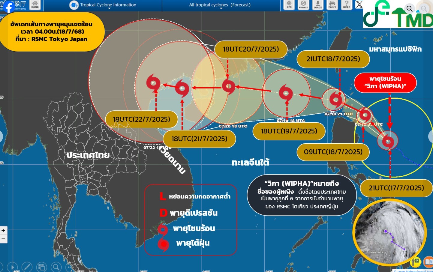 เช้าวันนี้ 18 ก.ค.68 เวลา 04.00น. วันนี้ พายุดีเปรสชันที่มีศูนย์กลางอยู่ทางตะวันออกของประเทศฟิลิปปินส์ได้ทวีกำลังแรงขึ้นเป็นพายุโซร้อน “วิภา (WIPHA)” แล้ว กำลังเคลื่อนตัวทางตะวันตกเฉียงเหนือ คาดว่าจะเคลื่อนผ่านหัวเกาะลูซอลประเทศฟิลิปปินส์ และลงสู่ทะเลจีนใต้ตอนบนในเช้าของพรุ่งนี้(19 ก.ค.68) หลังจากนั้นจะเคลื่อนผ่านทางตะวันออกเกาะไหหลำและเคลื่อนตัวเข้าใกล้ชายฝั่งประเทศจีนตอนใต้หรือเวียดนามตอนบน จะอ่อนกำลังลงเป็นหย่อมความกดอากาศต่ำเมื่อเคลื่อนขึ้นฝั่ง และเคลื่อนตัวตามแนวร่องมรสุมที่พาดผ่านภาคเหนือของไทย