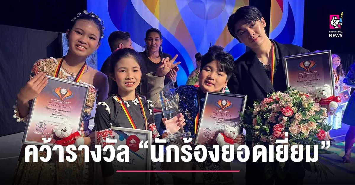 เด็กเชียงใหม่สุดเจ๋งคว้ารางวัล “นักร้องยอดเยี่ยม” จากการแข่งขันร้องเพลง Euro Pop Contest 2023 ซึ่งการแข่งขันร้องเพลง Euro Pop Contest 2023 ณ กรุงเบอร์ลิน ประเทศเยอรมัน จัดขึ้นระหว่างวันที่ 24-26 พฤศจิกายน 2566 รวมผู้เข้าแข่งขันกว่า 60 คน จาก 20 ประเทศทั่วโลกมีตัวแทนประเทศไทยเข้าร่วมการแข่งขันในครั้งนี้ทั้งหมด 4 คน ได้ “น้องอี้ซิน” ธัญวรันณ์ ทัศน์ประเสริฐสิน, น้องกวี ชนาภัทรวรโชติ และ”น้องเอิญ”ณพิชชา ทัศน์ประเสริฐสิน เข้าแข่งขันในรุ่นอายุ 8-13 ปี และ “น้องโพธิ์”ภูวเดช ทิวไทยงาม เข้าแข่งขันในรุ่นอายุ 18-24 ปี